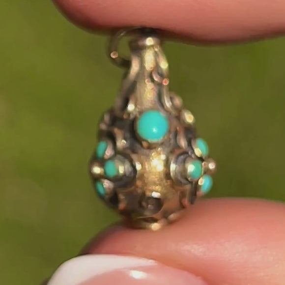 VERY GOOD. This Victorian 9ct Gold Turquoise flower drop charm is in very good condition. The Turquoise cabochons are all secure with no damage to note and display a variety of glacial hues. There is some darkening to the body of the pendant, enhancing the Gold-work that surround the Turquoise. She will look right at home amongst your other Gold goodies!