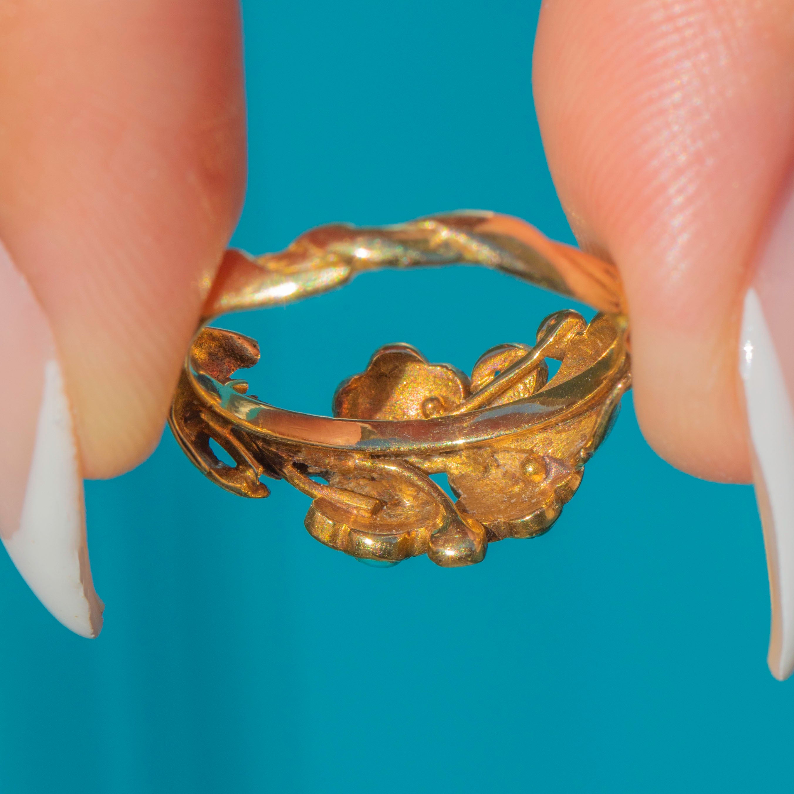 This exquisite Victorian ring is crafted in 18ct Gold and designed as a bouquet of forget-me-not flowers, each bloom set with vivid Turquoise cabochons. The naturalistic design continues around the shoulders with finely modelled leaves, creating a jewel that is both romantic and full of symbolic meaning.