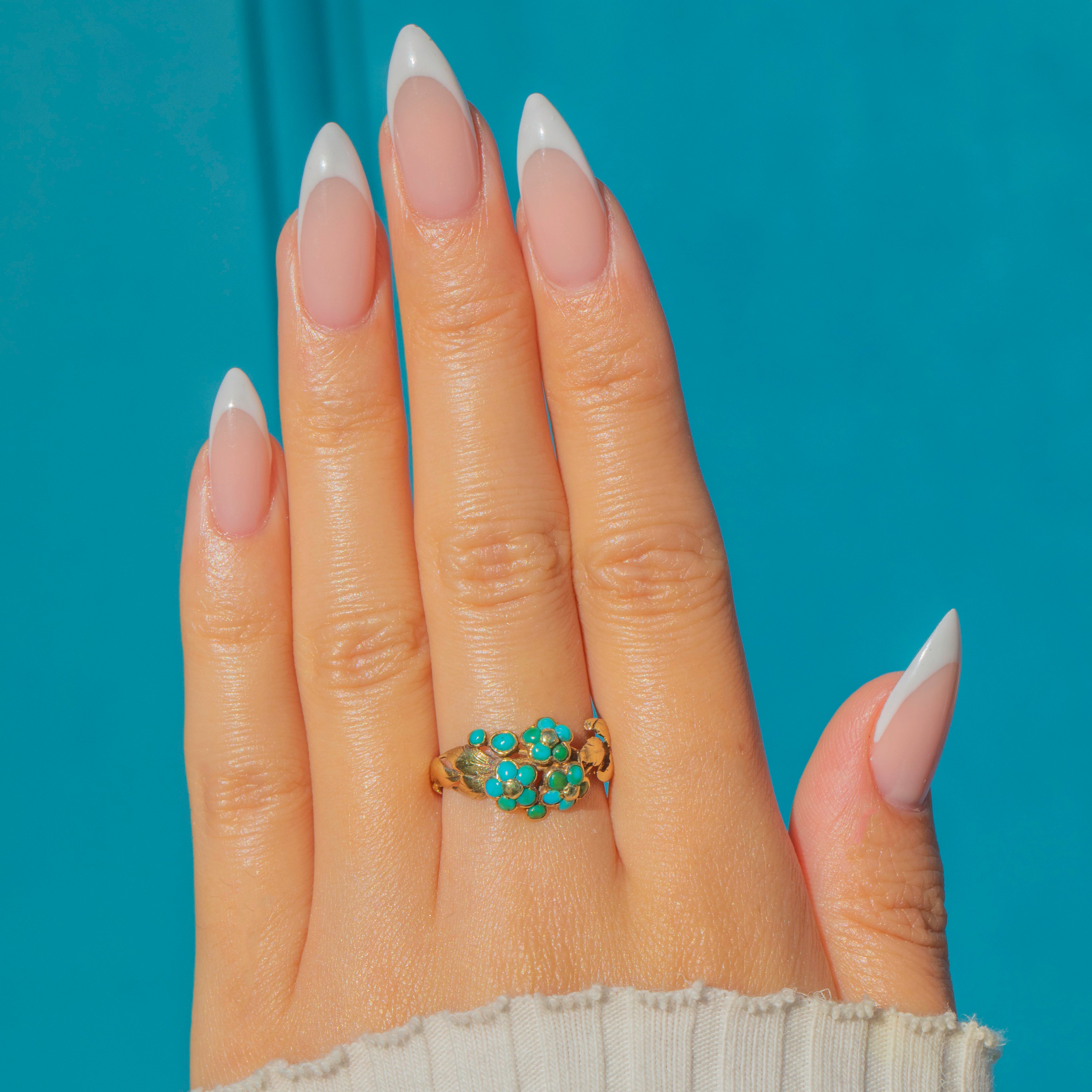 Forget-me-nots were a popular motif in the 19th century, representing enduring love and remembrance. Combined with the bright Turquoise, this ring captures the sentimentality and elegance of the Victorian era in a wonderfully wearable form.