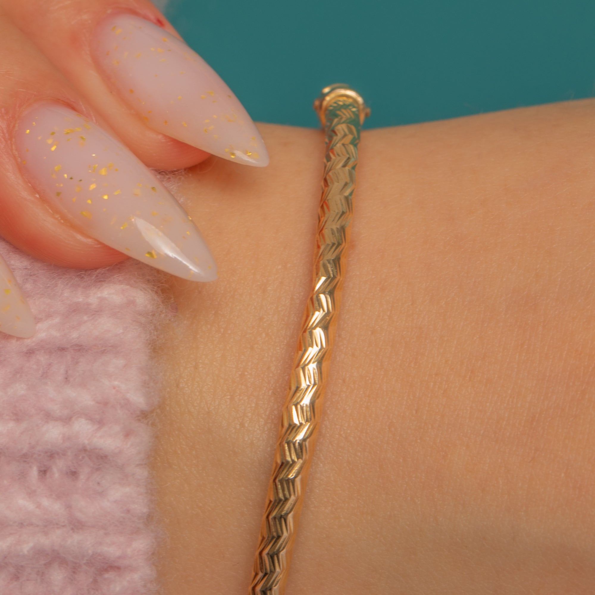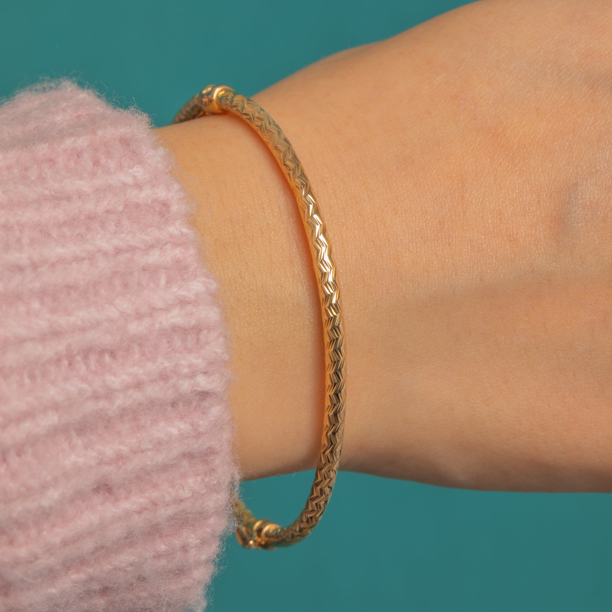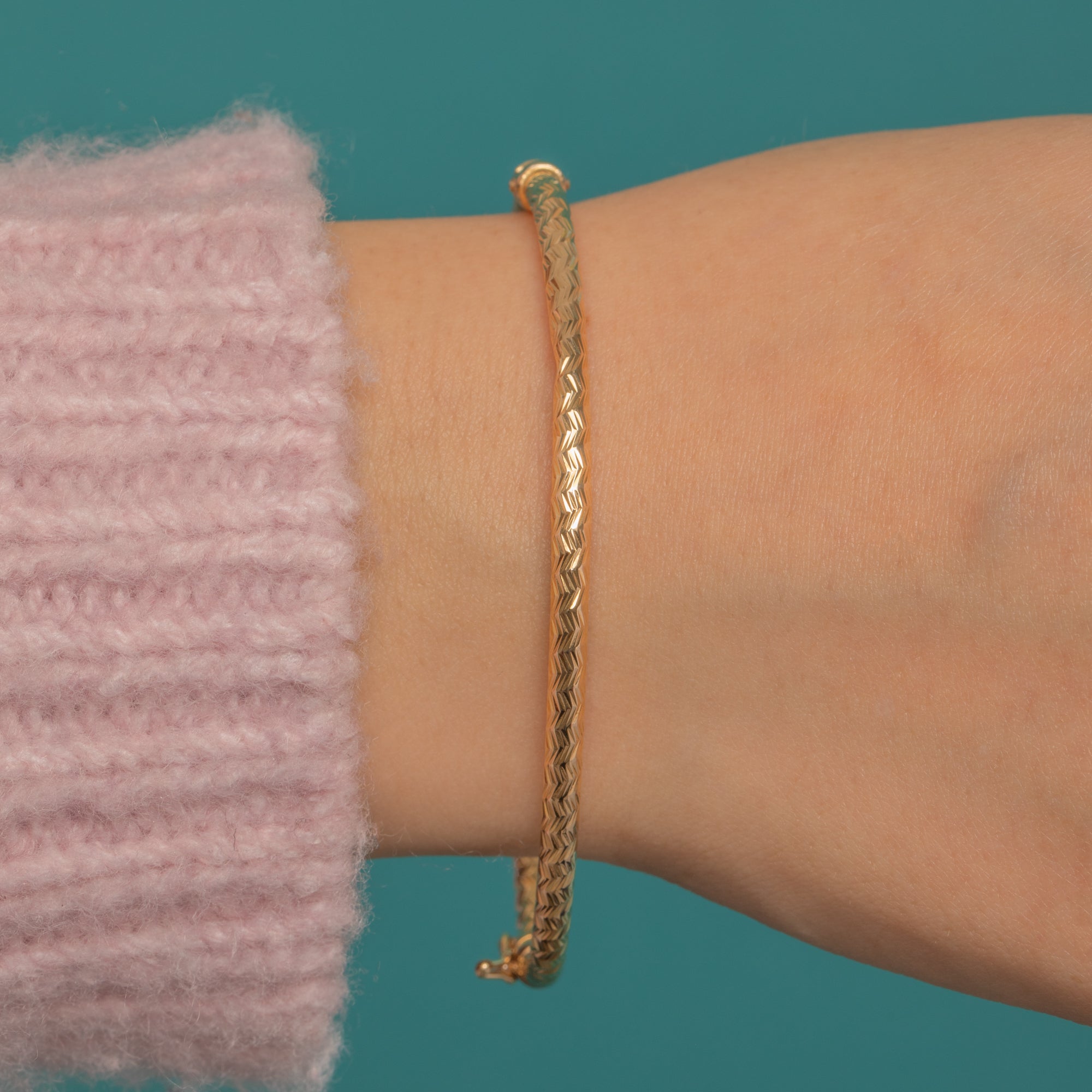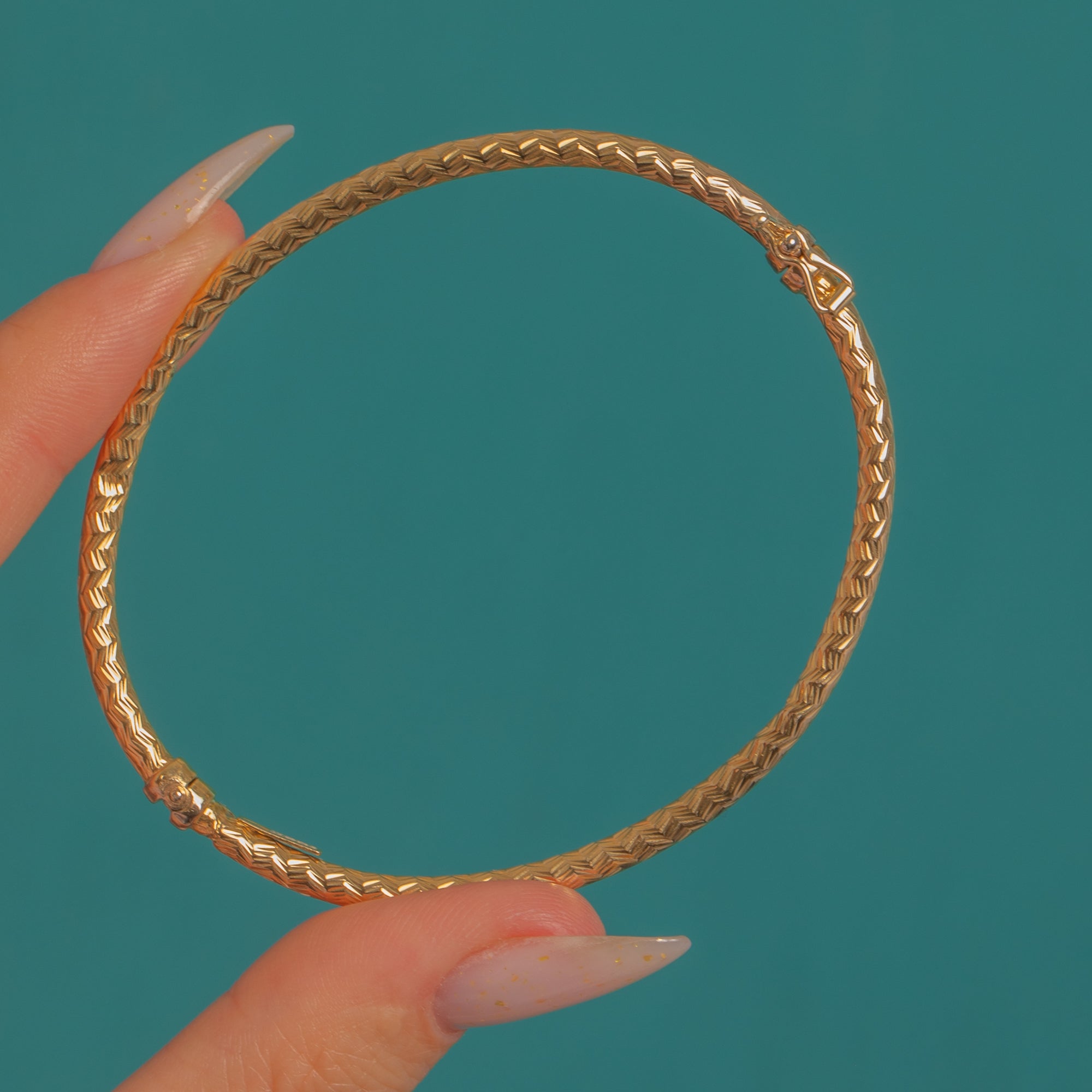 Sleek and timeless, this Vintage 9ct Gold hinged bangle is adorned all over with crisp chevron engine-turned engraving that shimmers as it moves. Its slender tubular profile and polished finish feel effortlessly refined—equally beautiful worn solo or stacked for a layered look.