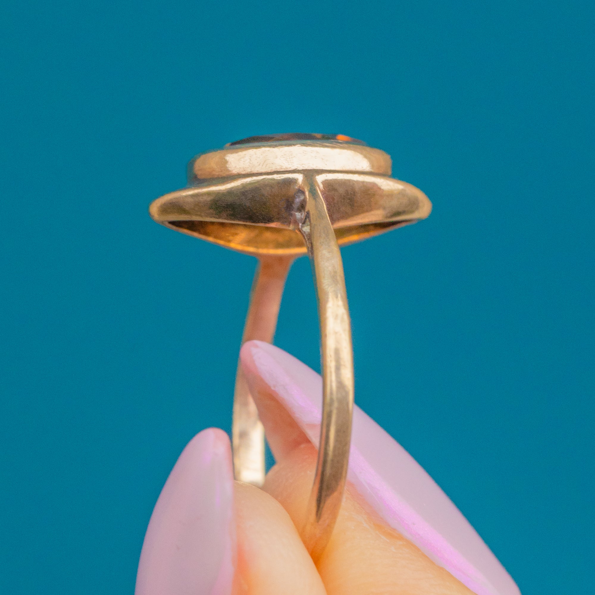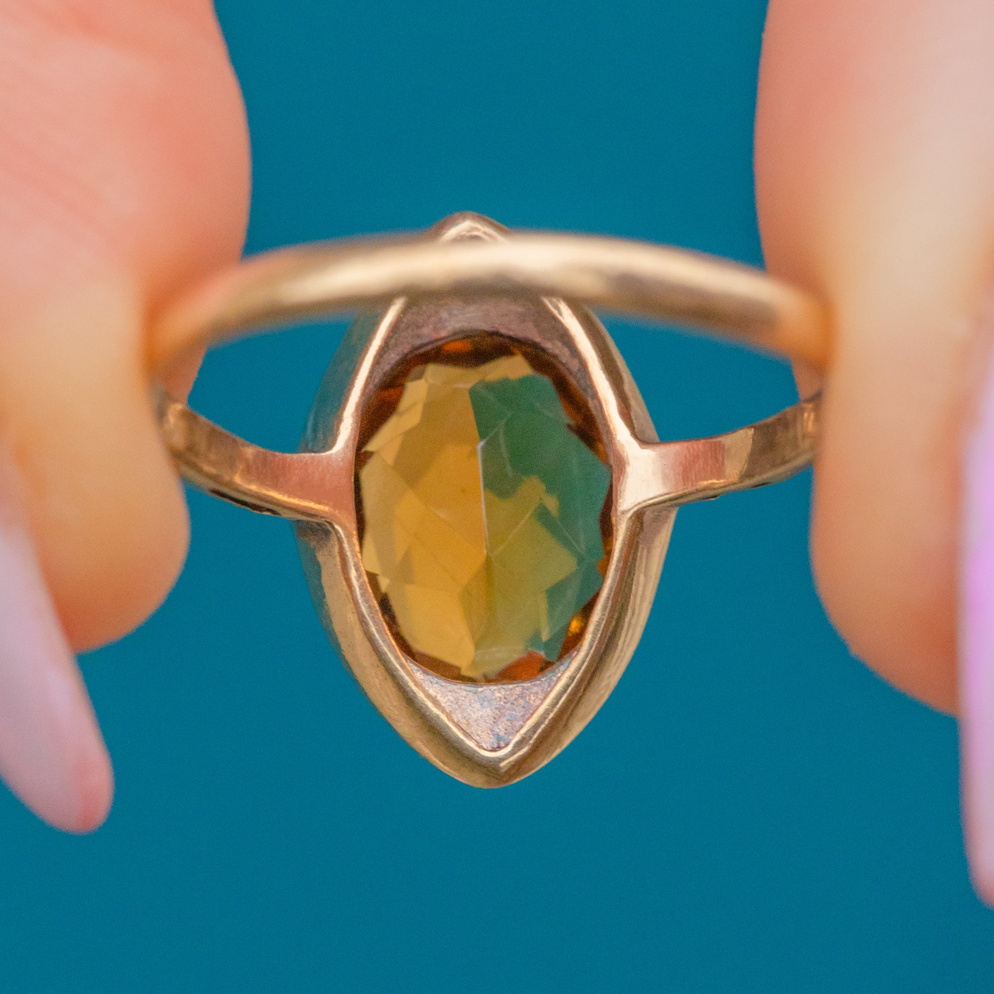 This bold Mid-Century ring centres on a radiant golden Citrine of approximately 8.8 carats, its sunny glow and impressive size exuding vintage glamour. The beautifully faceted stone is claw-set in warm 9ct Gold, allowing light to flood through and enhance its natural brilliance.