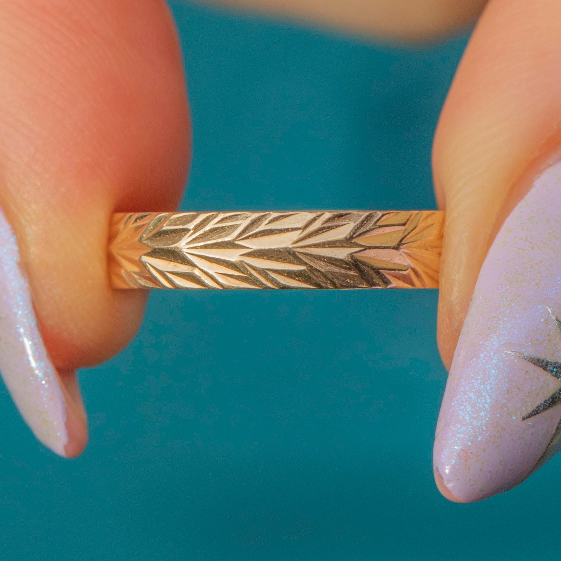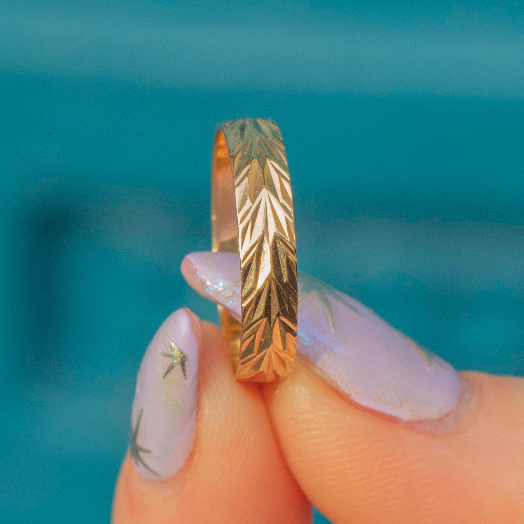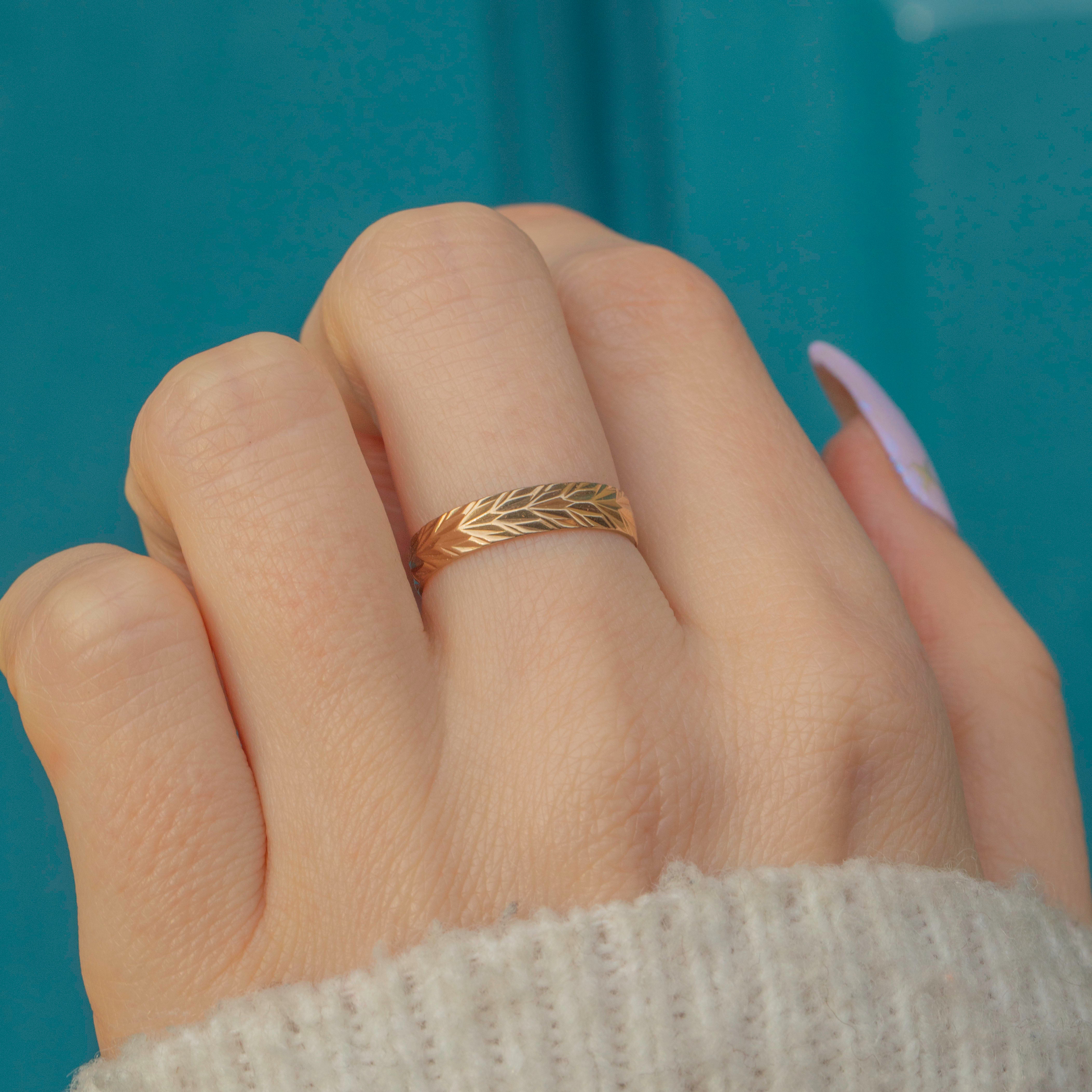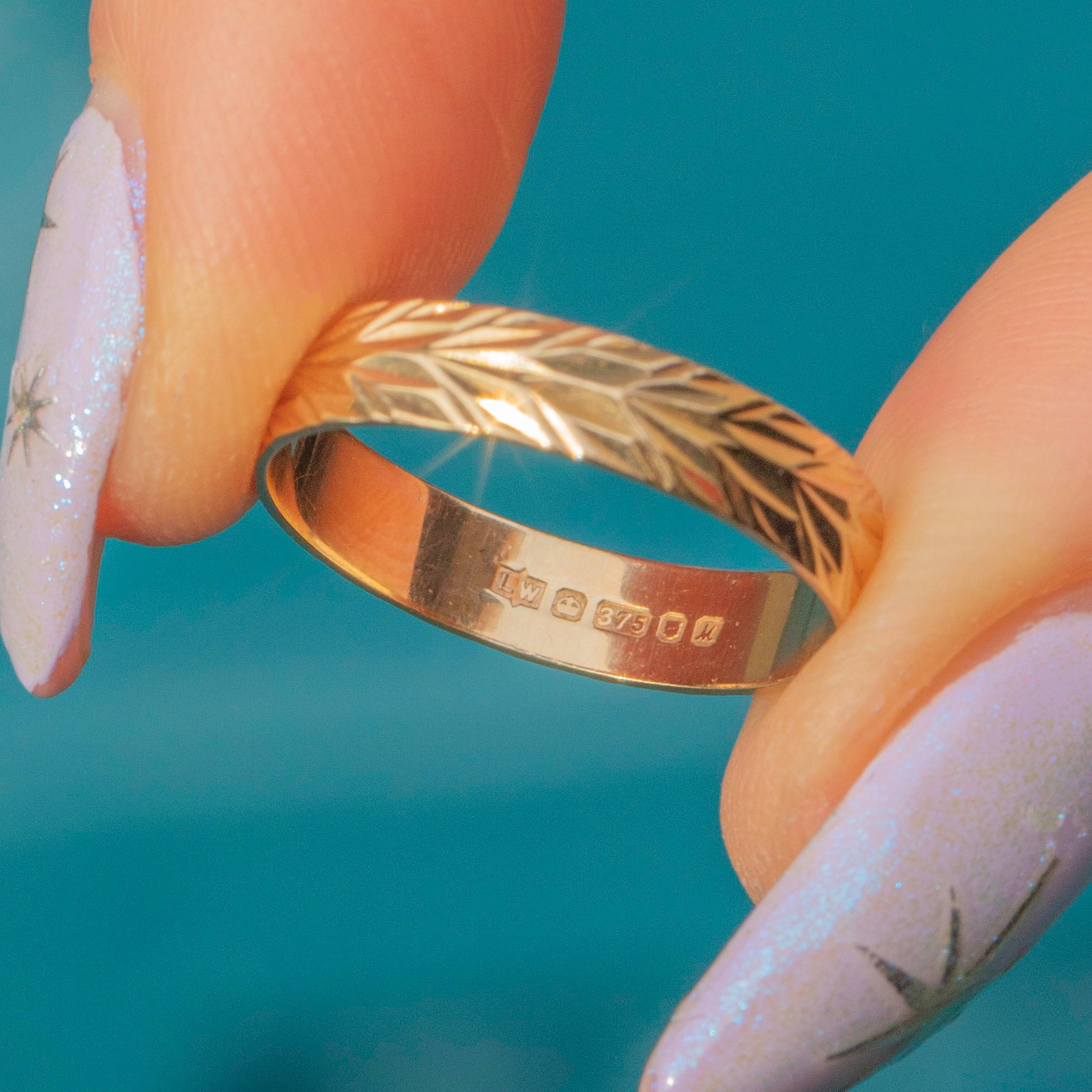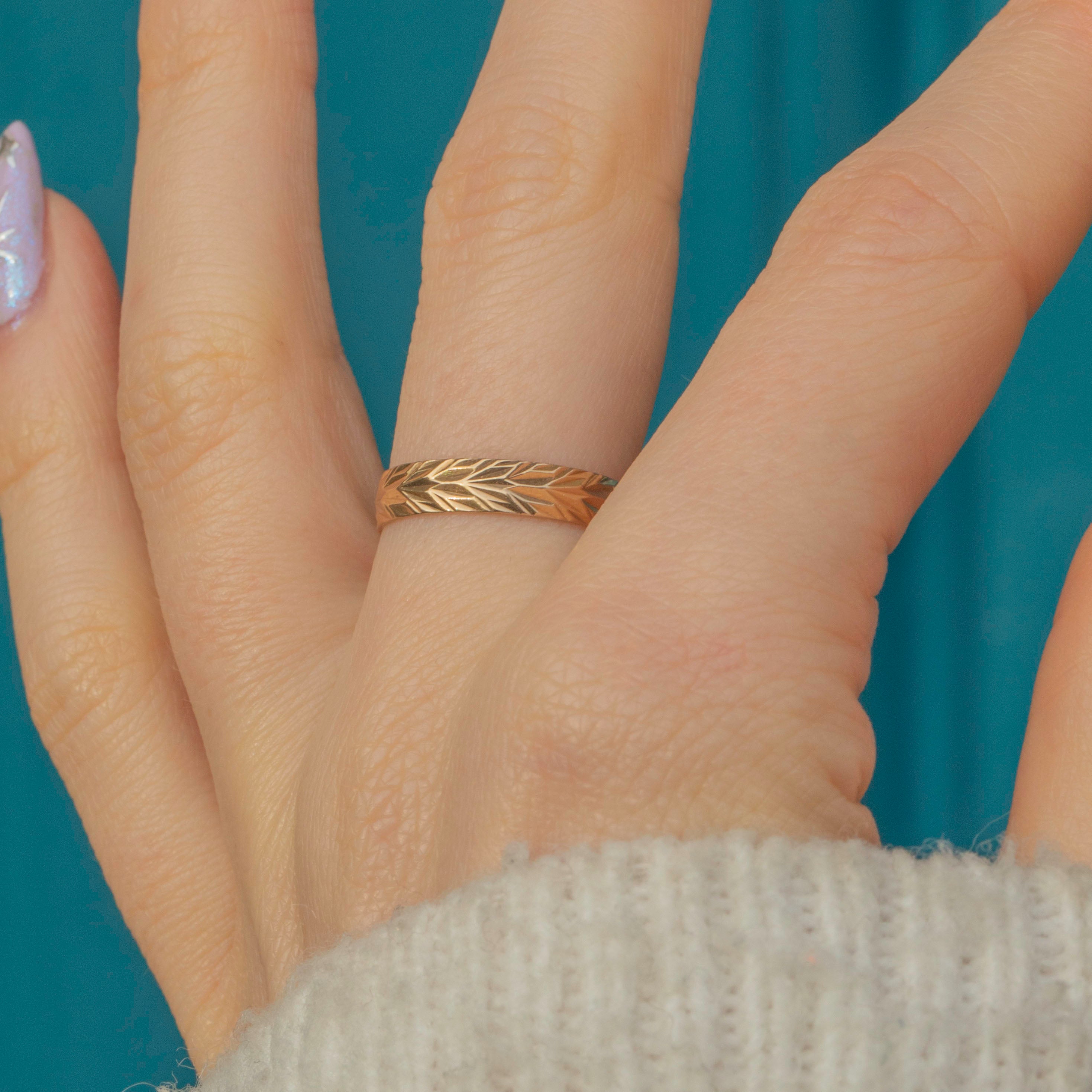 Crafted from luscious 9ct Gold, she features an intricately engraved band providing a lovely texture and depth. Great for stacking alongside other rings, this vintage 9ct Gold band is soon to become your next staple piece!