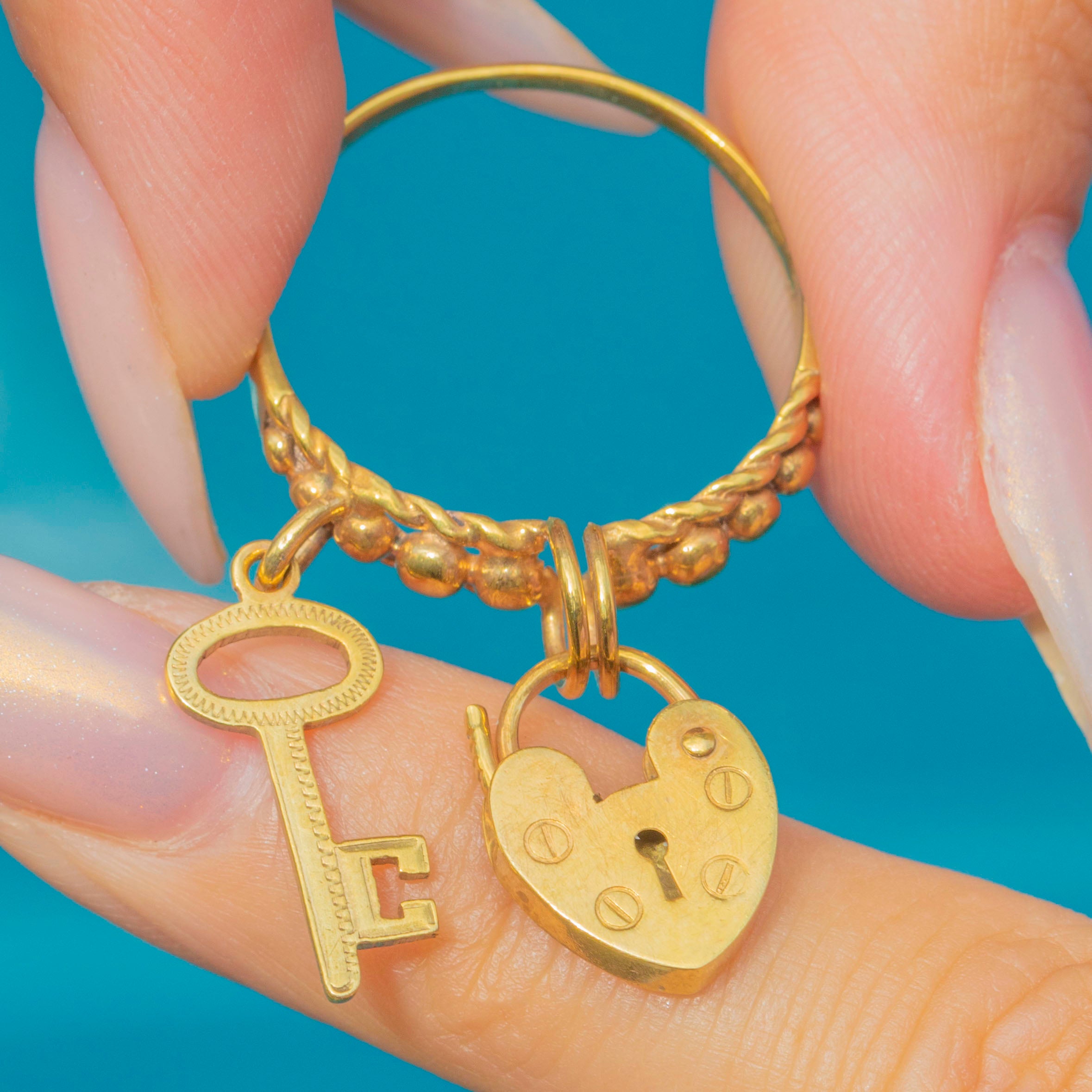 A charming Vintage 9ct Gold Heart Padlock & Key ring, c.1975, featuring a fully functioning heart padlock and a dangling key charm. The ring combines playful sentiment with elegant detailing, including rope and bead textures that catch the eye.
