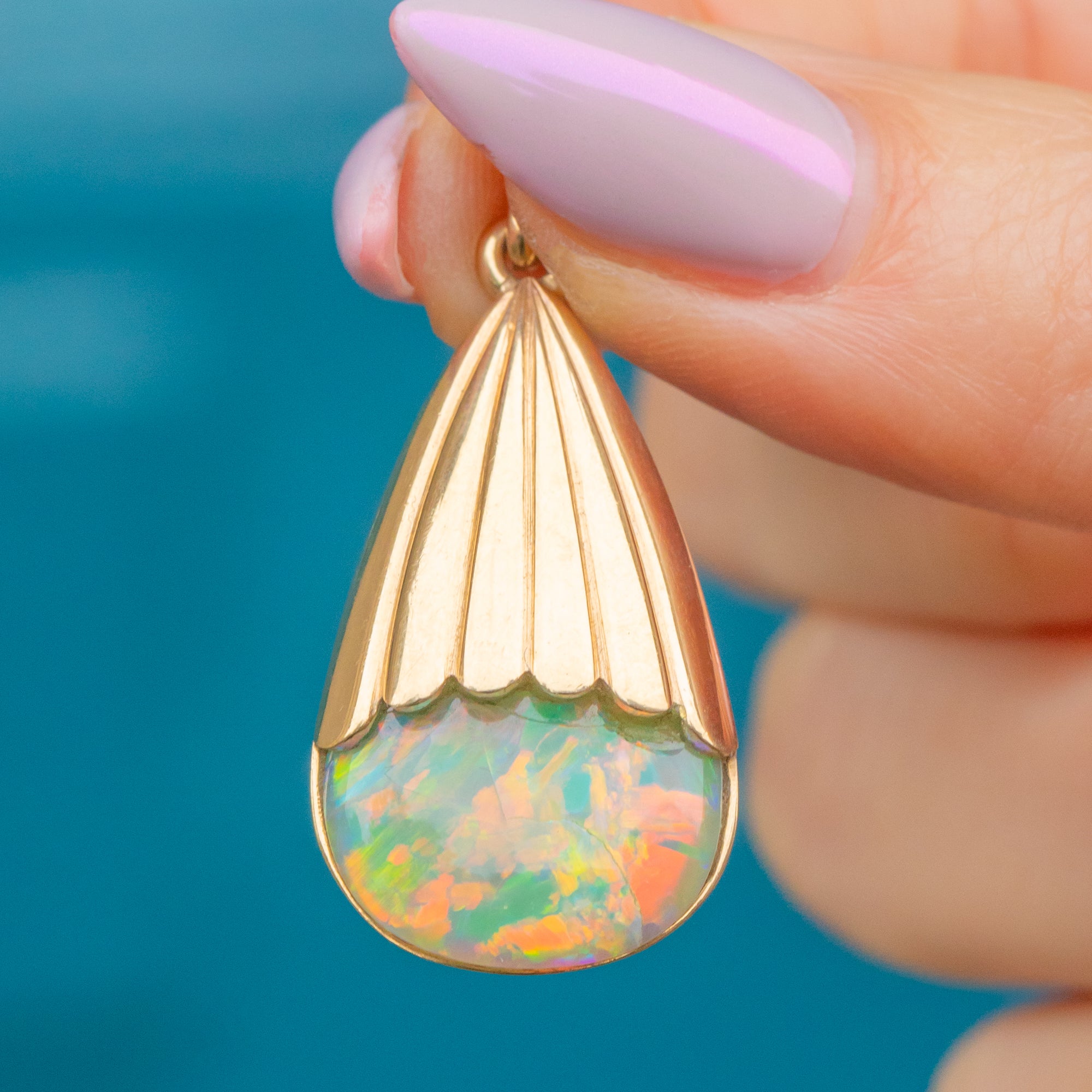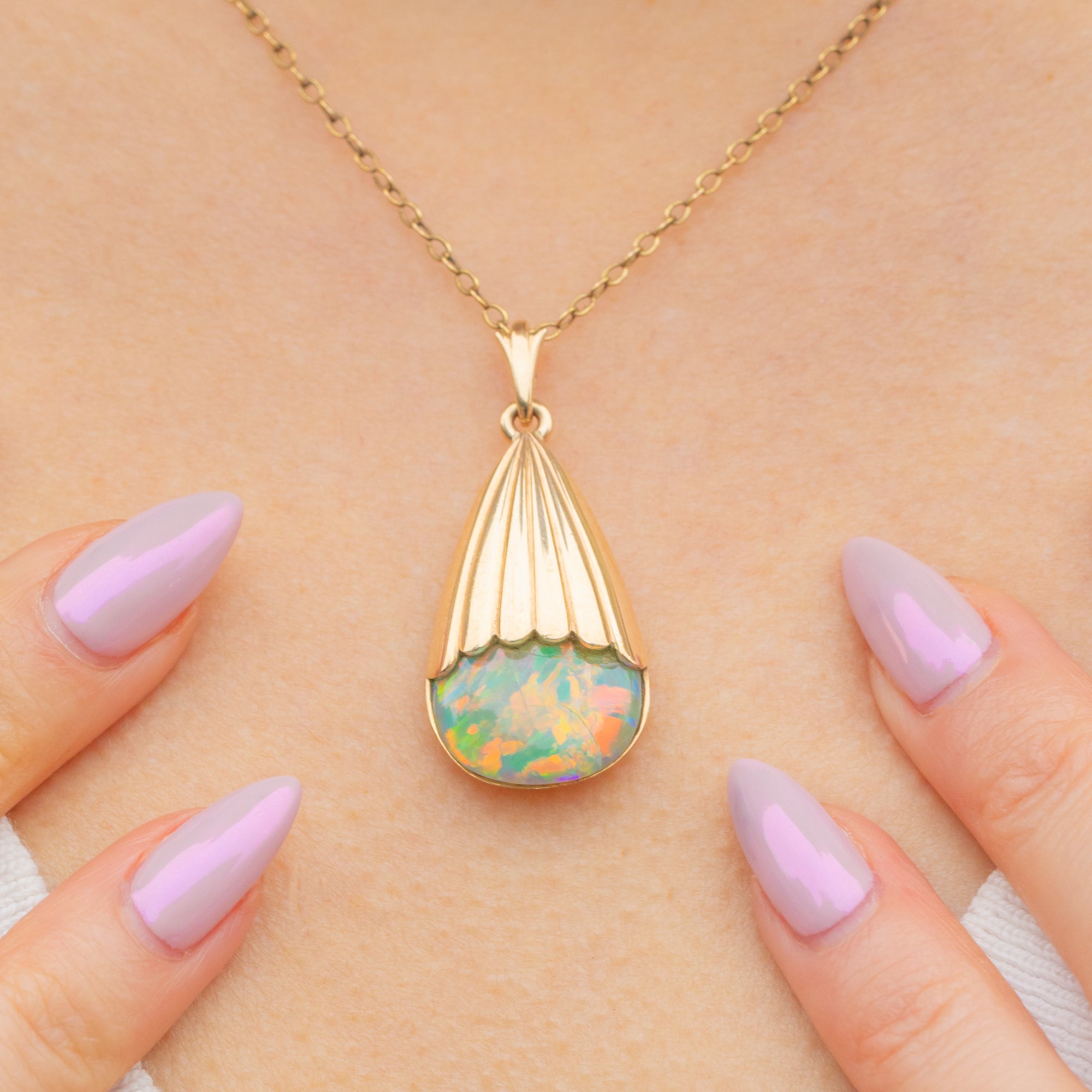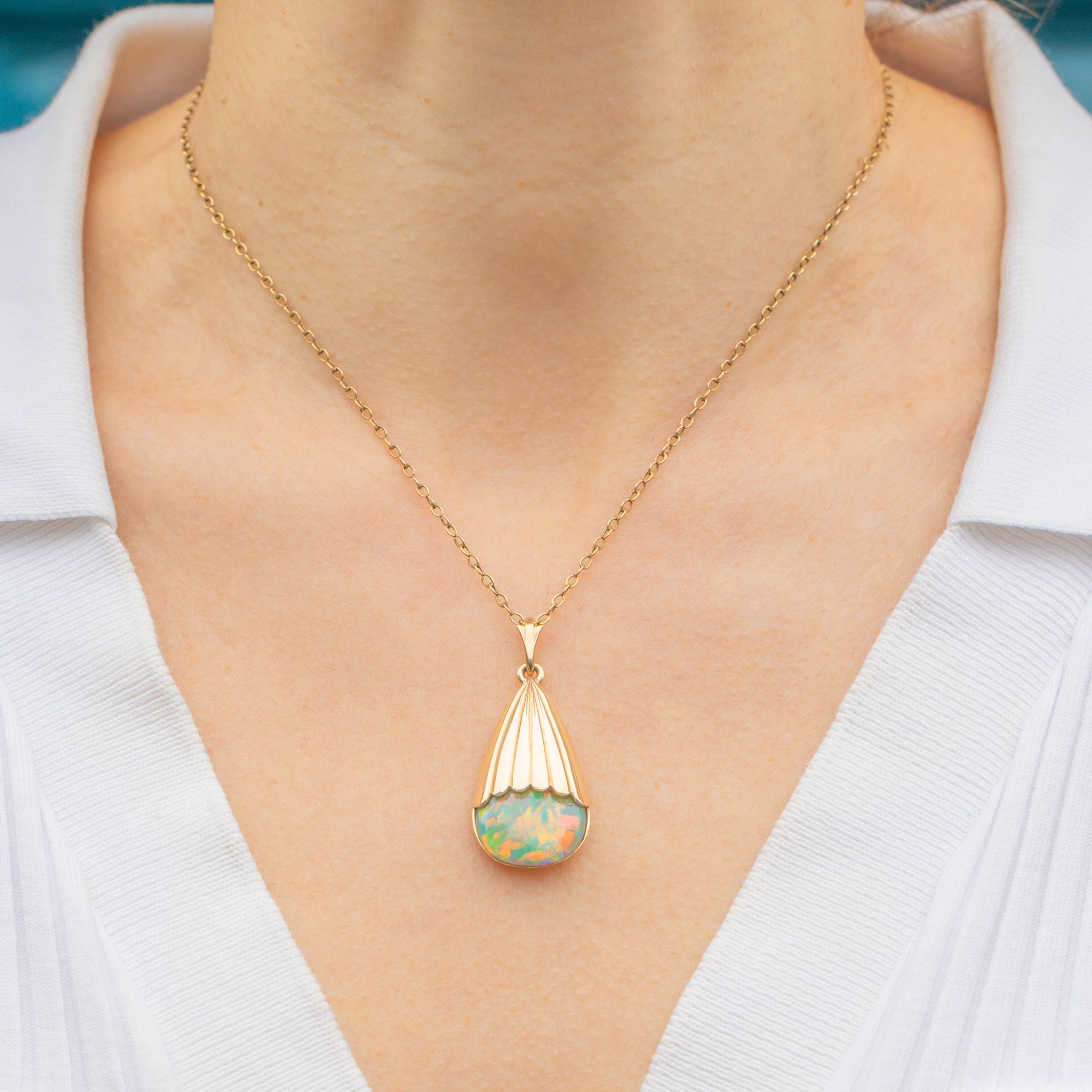 This striking Vintage pendant is crafted in solid 9ct Gold and set with a glowing 3.18ct Opal cabochon, displaying beautiful flashes of green, orange and blue. The Opal rests within an ornate scalloped frame, its soft, rounded edges adding a lovely sense of movement and texture.
