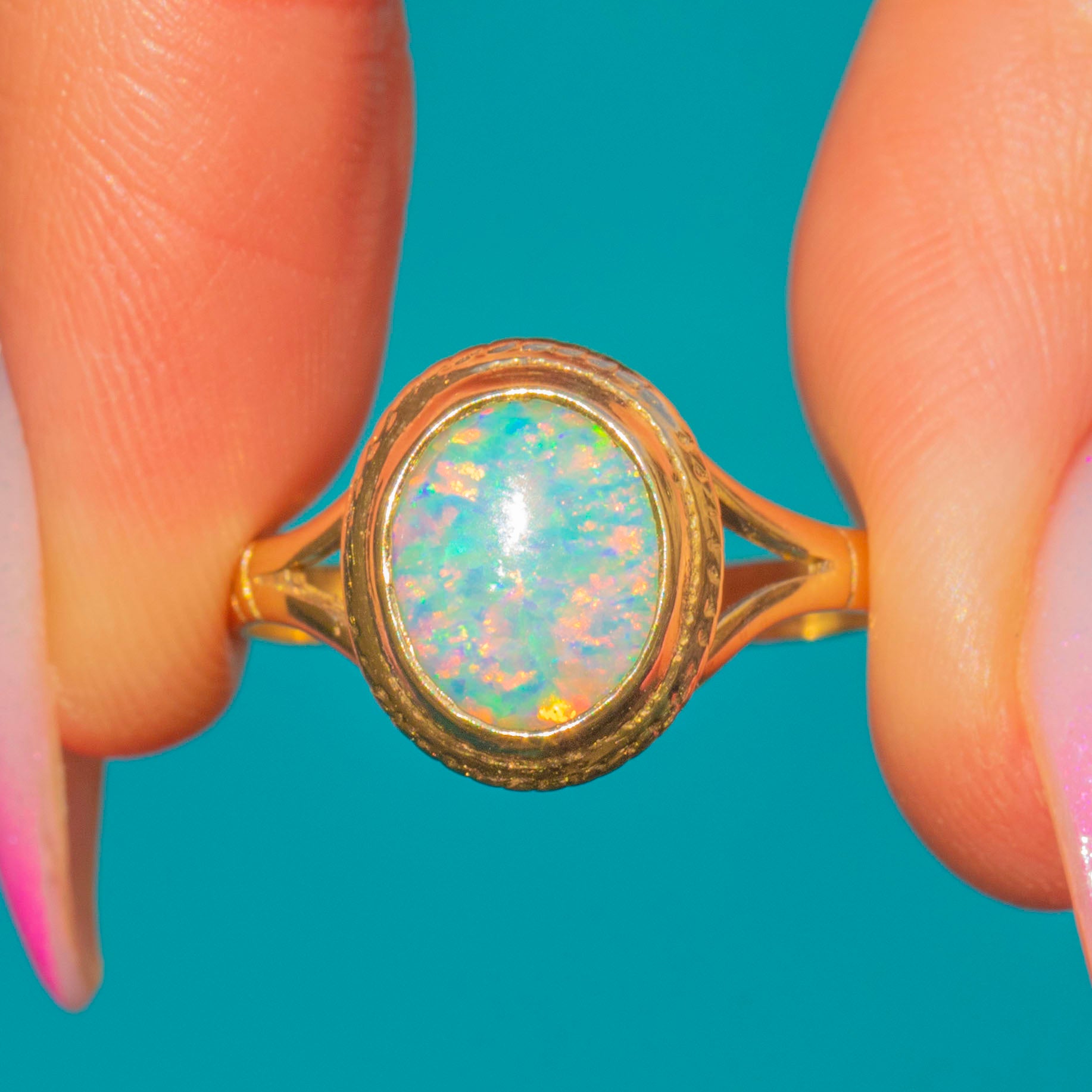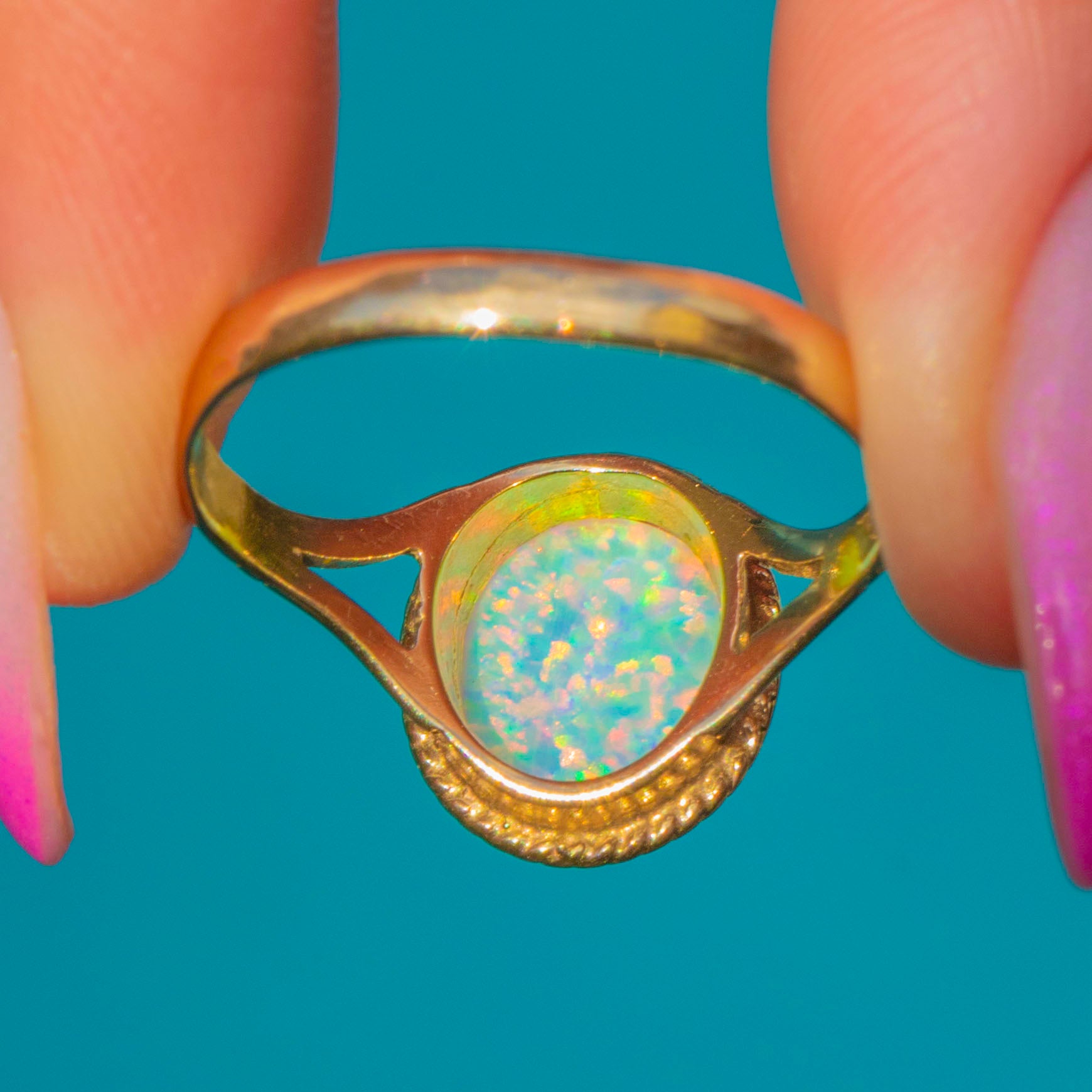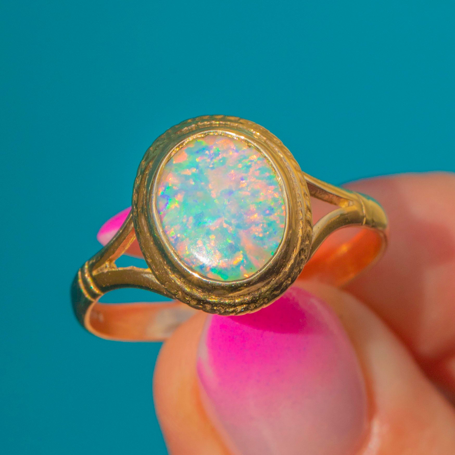 VERY GOOD: The Opal is bright and secure with no visible chips or cracks, showing vibrant play-of-colour. The Gold displays light surface wear and tiny nicks to the bezel edge with a gentle patina in the galleries, consistent with age. A subtle line on the shank suggests a past resize; the ring is stable and ready to wear.