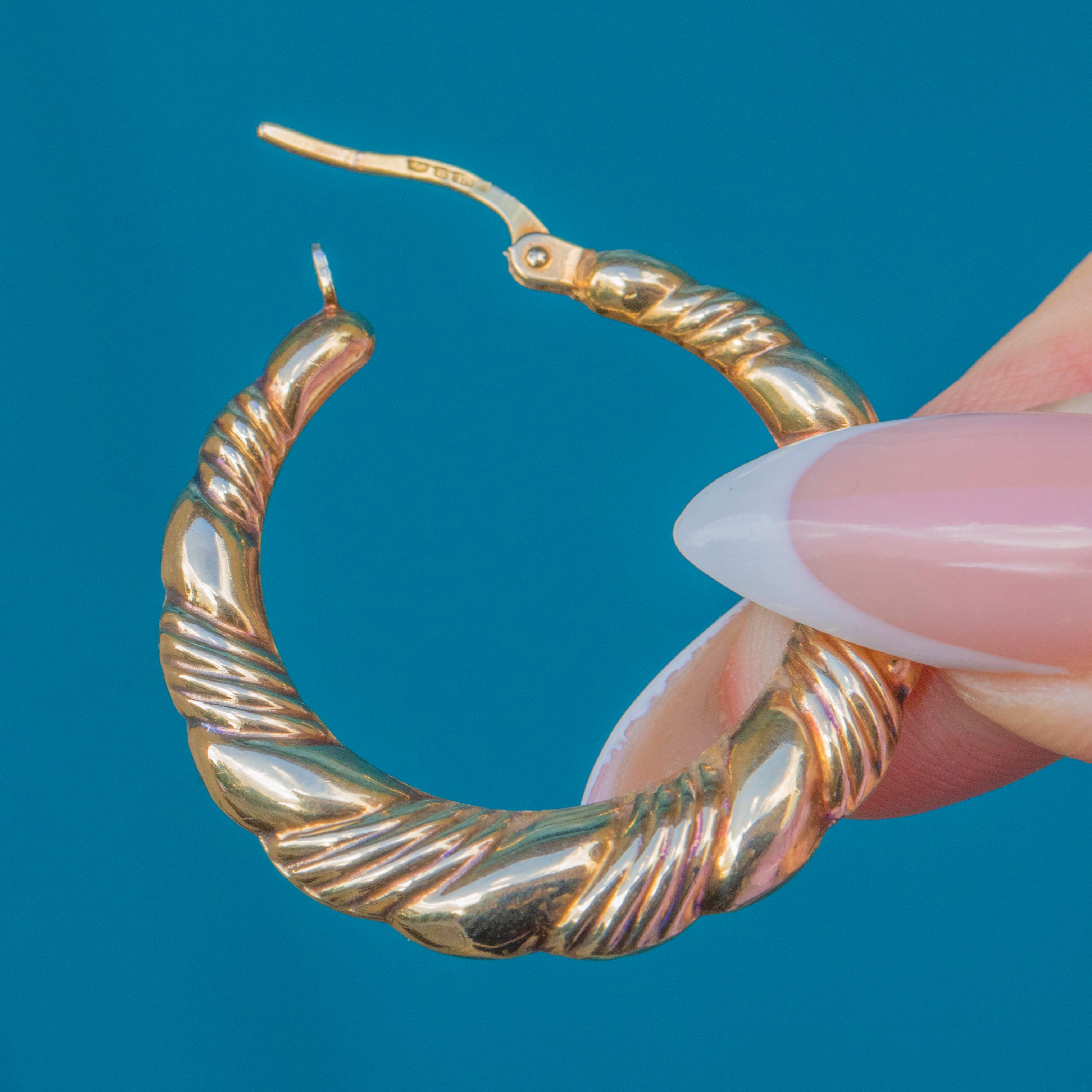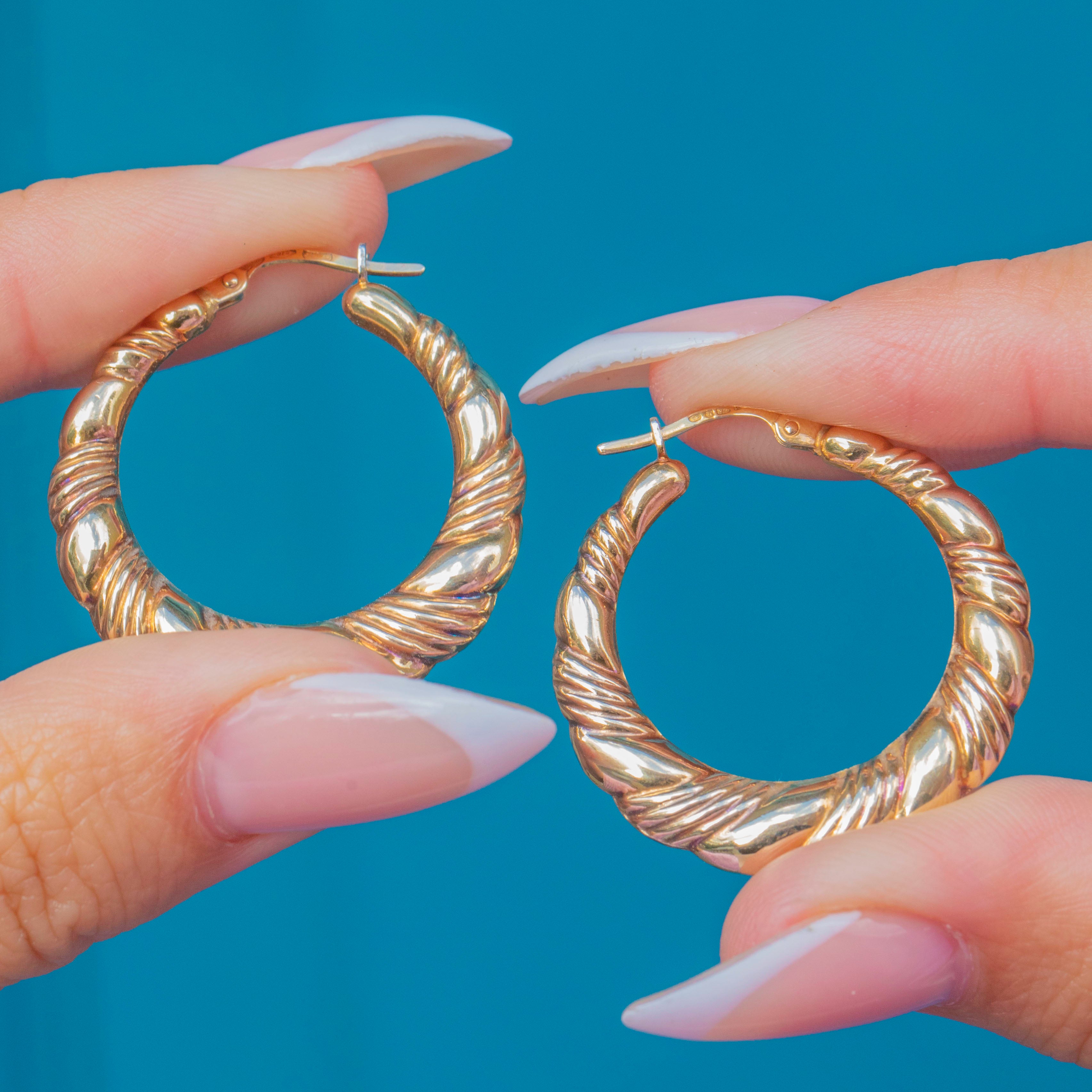 A fabulous pair of large vintage 9ct Gold hoop earrings with a bold twisted design. Their chunky rounded form and polished finish make them a striking yet versatile accessory, perfect for elevating any outfit from day to night.