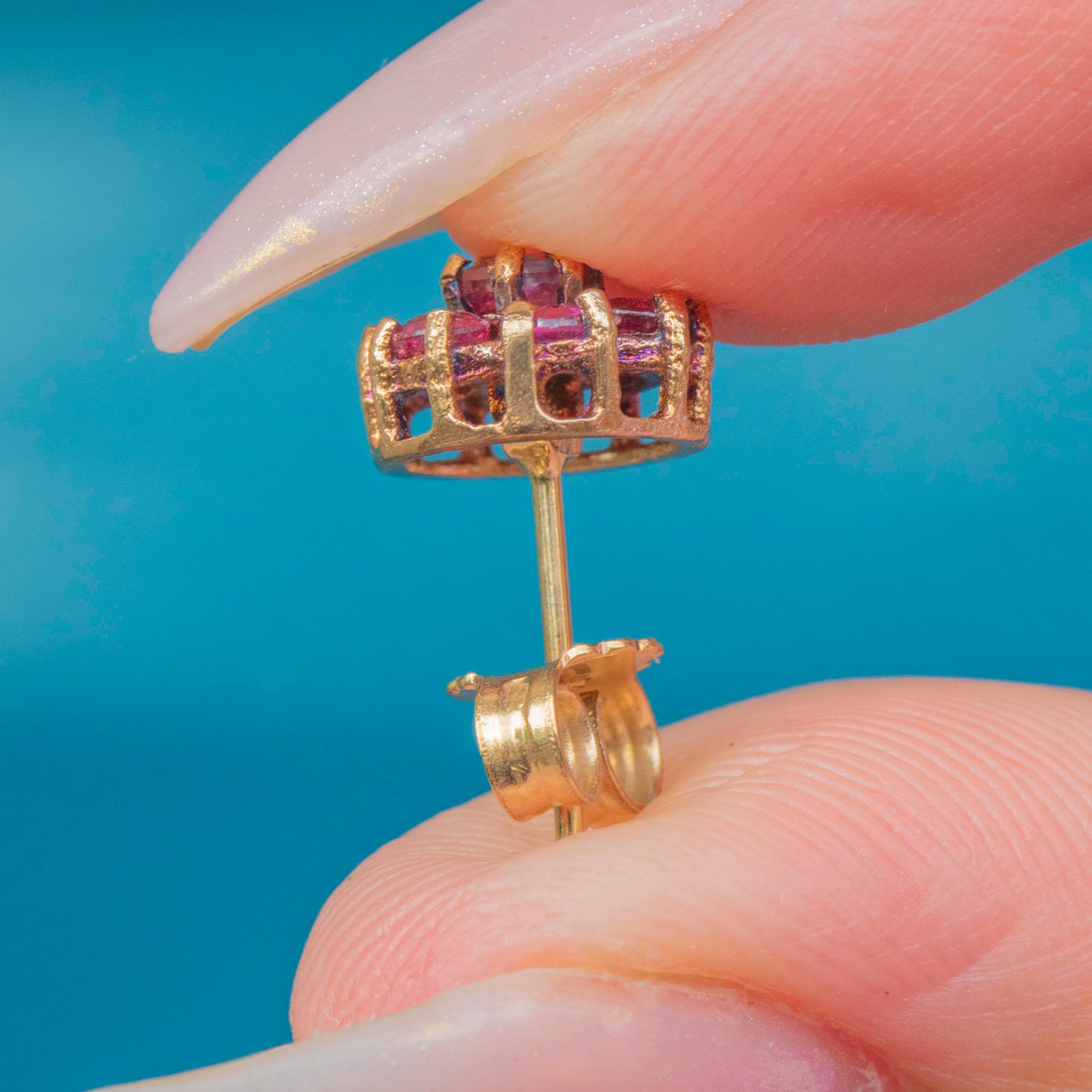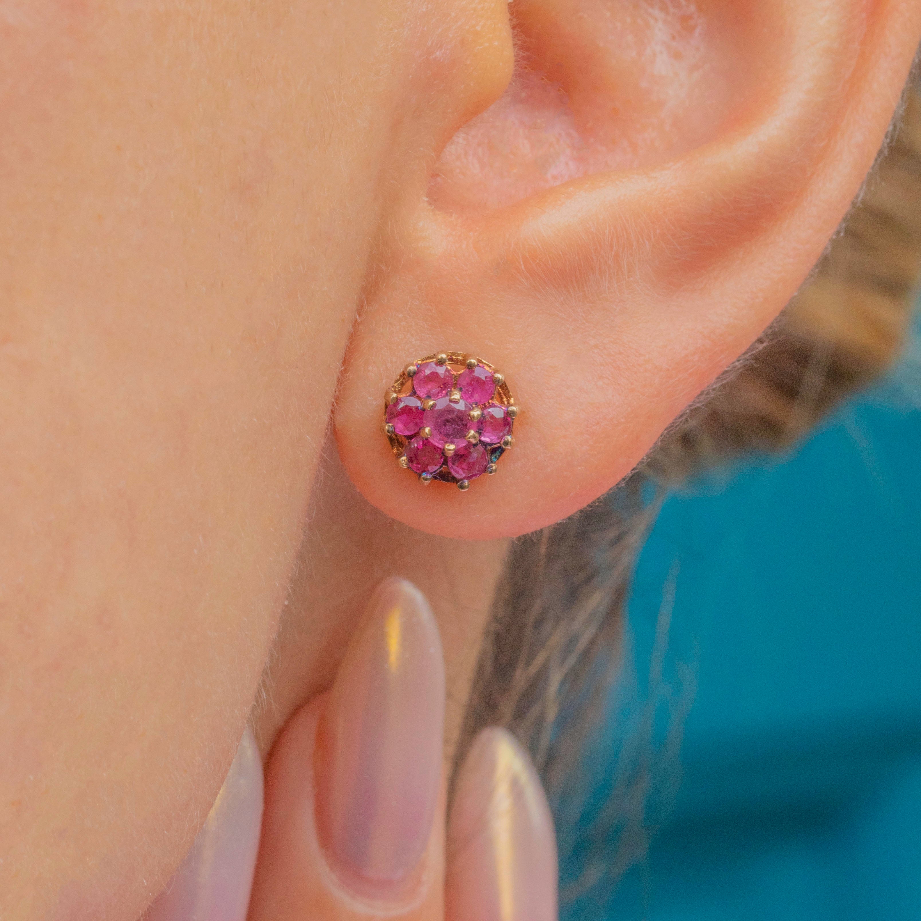 A pair of vibrant Vintage 9ct Gold Ruby Cluster stud earrings, c.1980s, featuring clusters of well-matched Rubies.