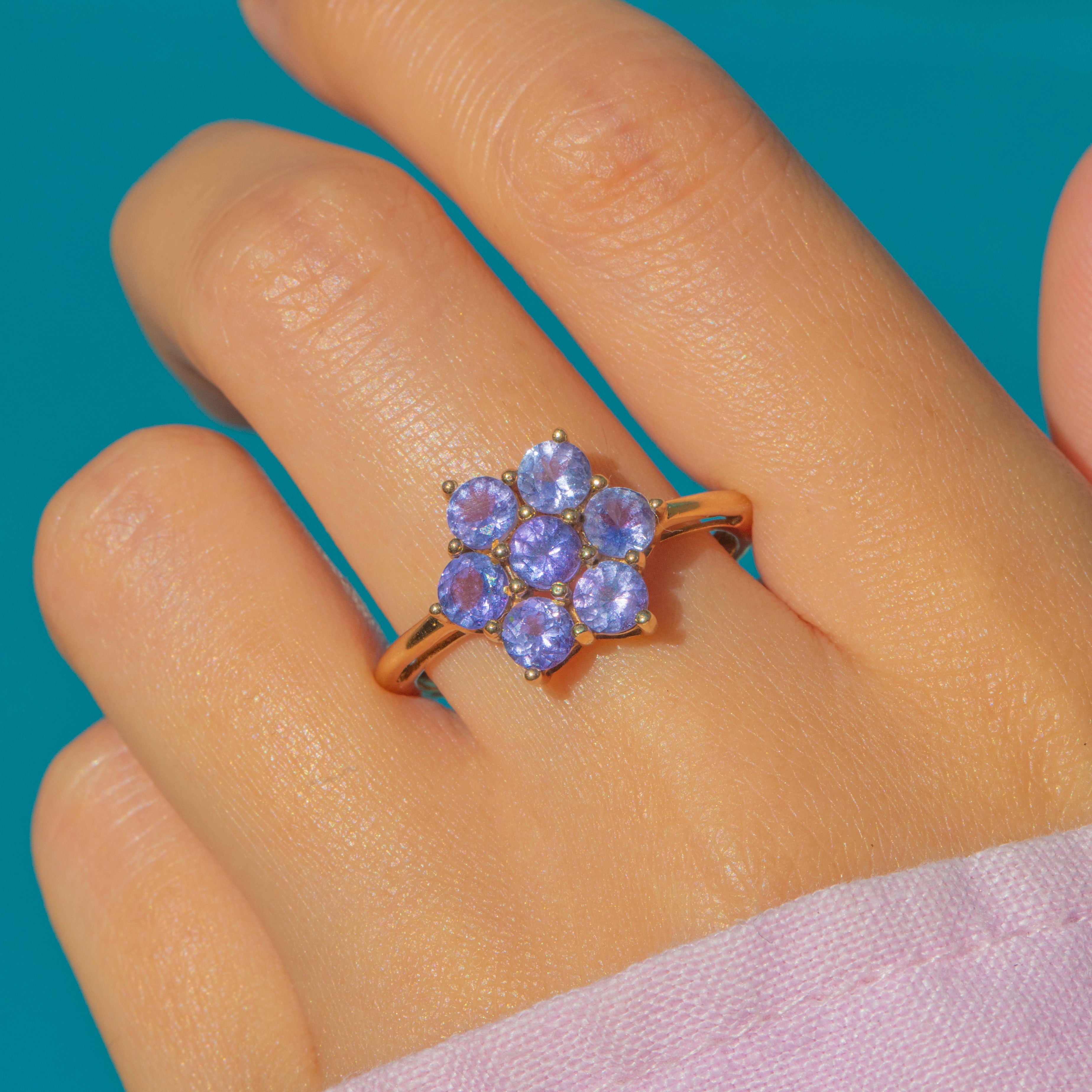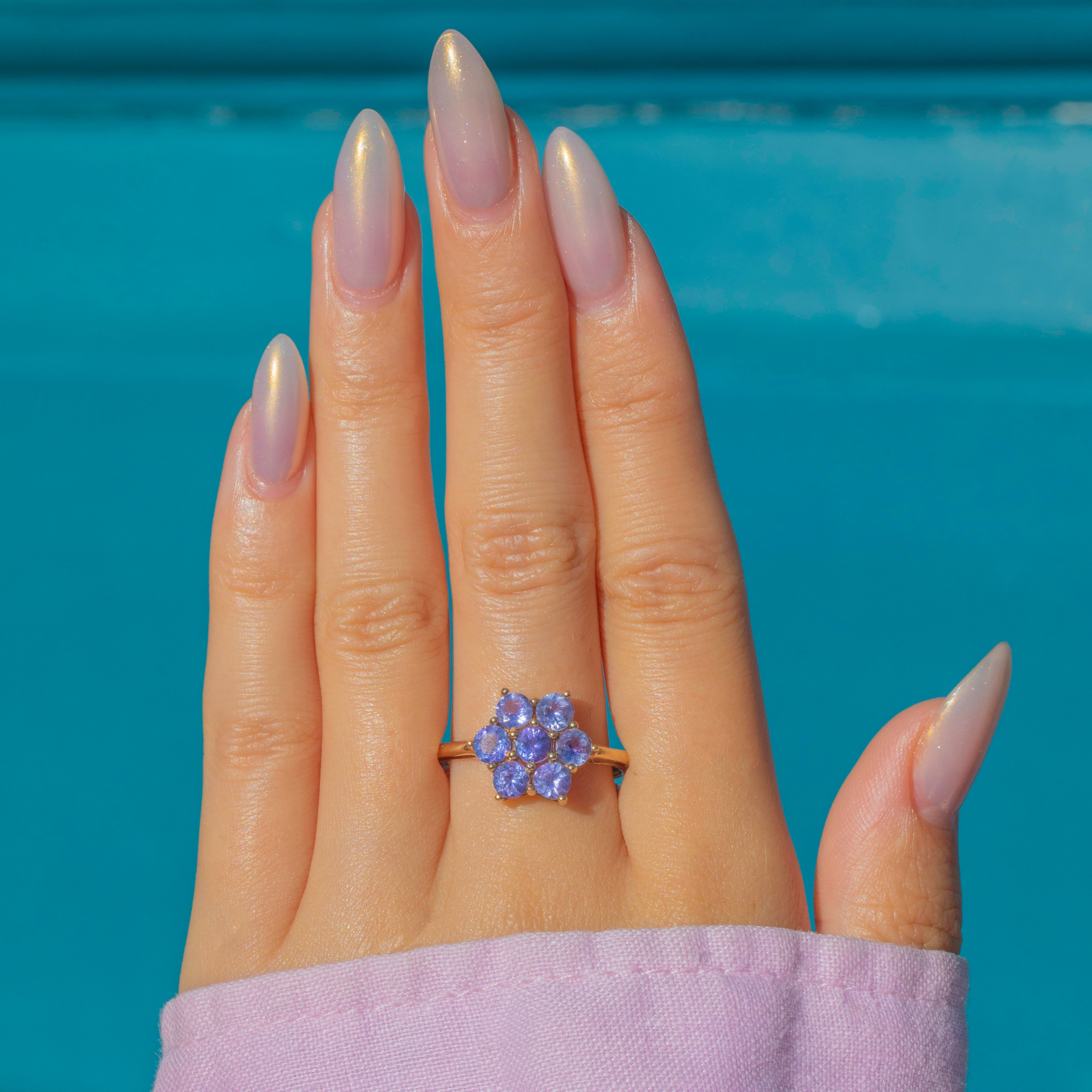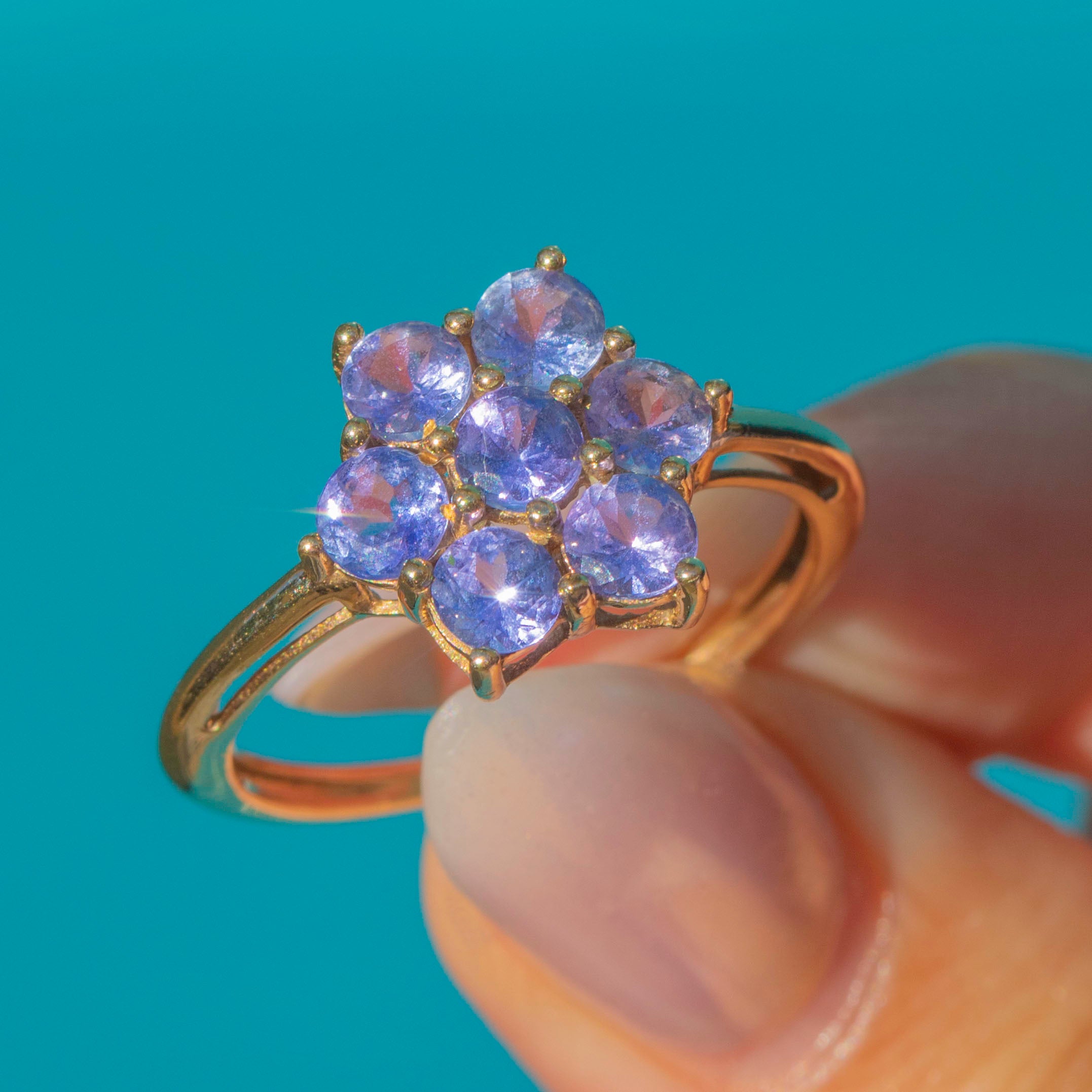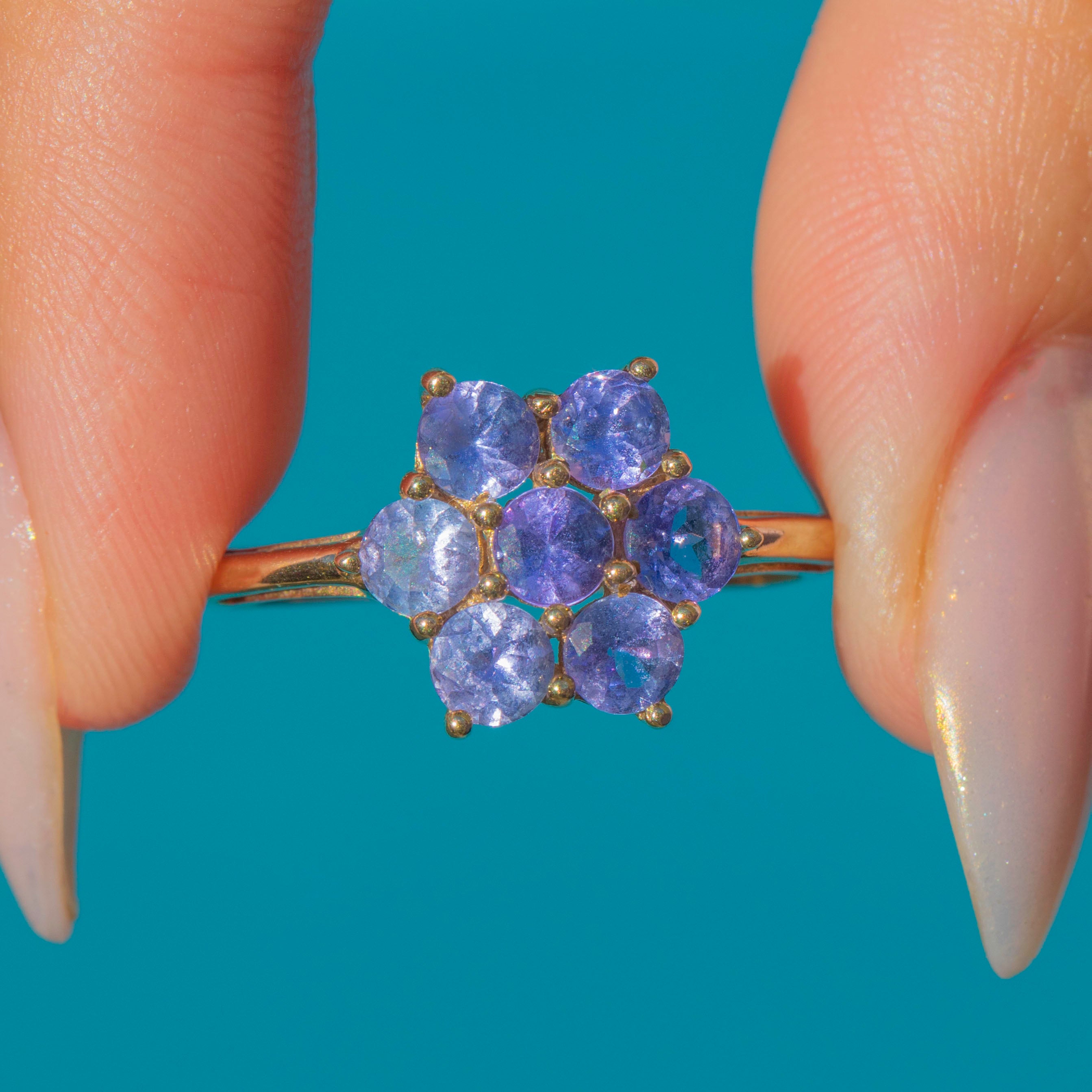 This Vintage Tanzanite cluster ring is full of colour and sparkle, set with seven round brilliant-cut natural Tanzanites in a bold floral arrangement. The stones range from cornflower blue to soft lilac, catching the light beautifully against the 9ct Yellow Gold setting. With its classic cluster design and delicate symmetry, this piece makes a charming addition to any collection, perfect for both everyday wear and special occasions.