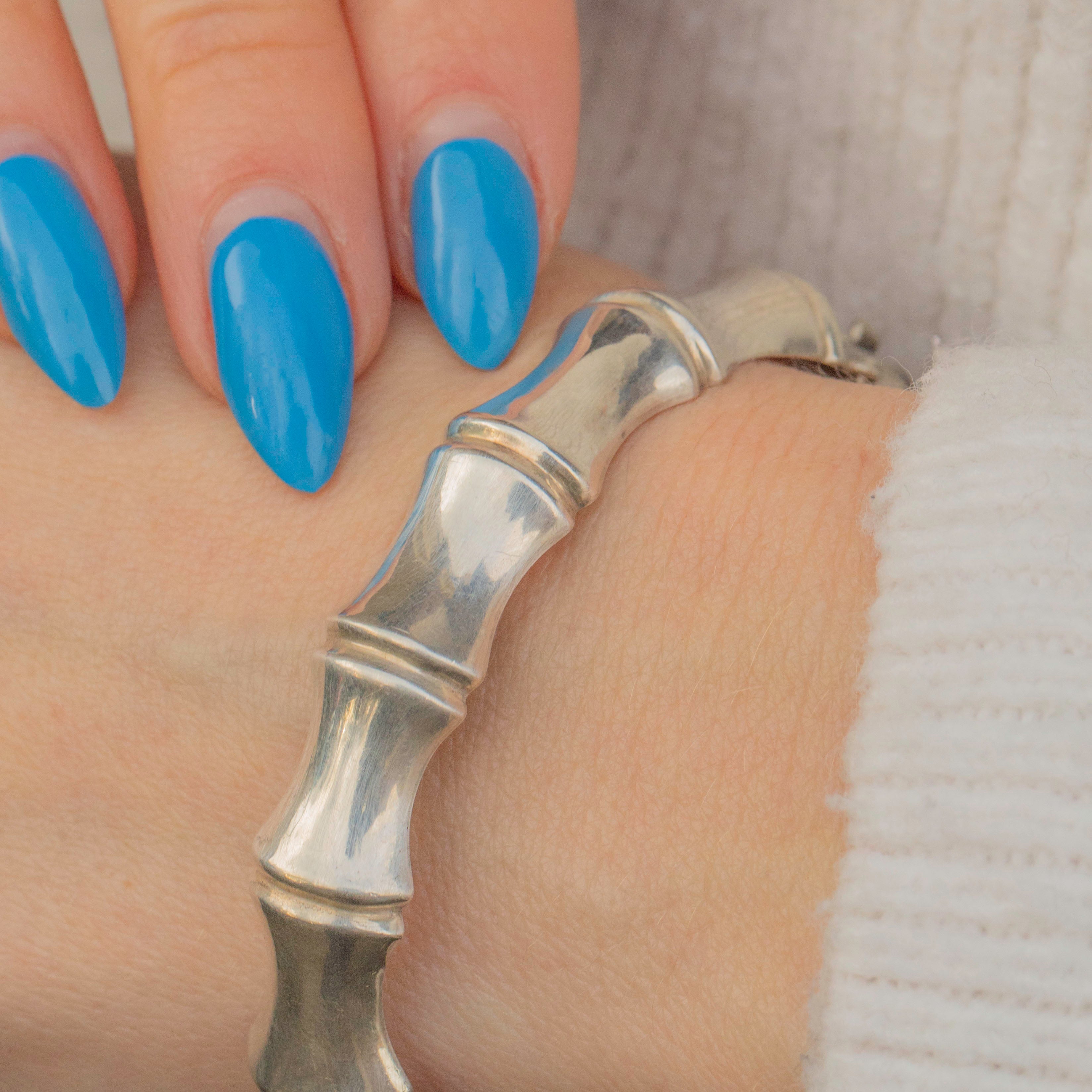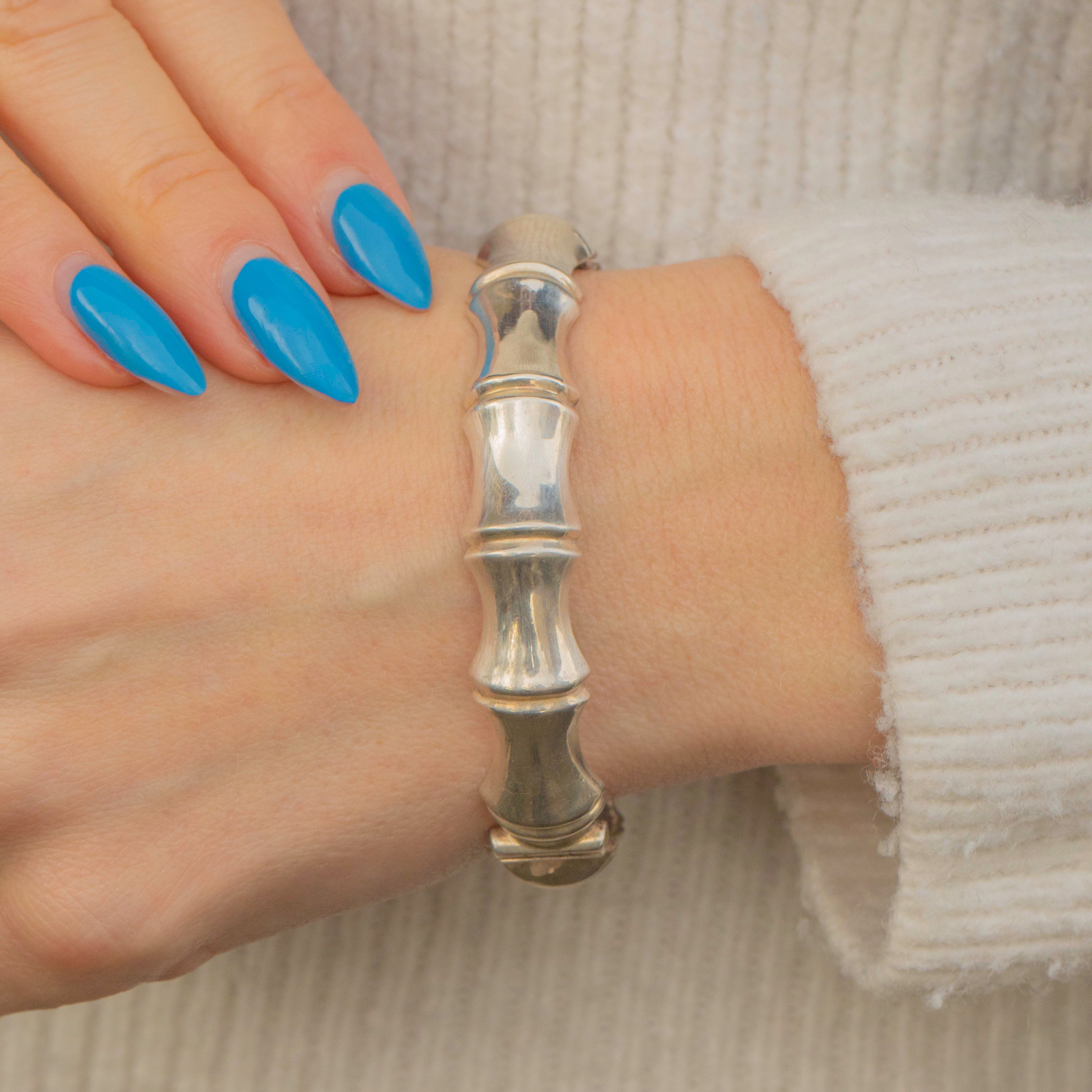 VERY GOOD-EXCELLENT: This Sterling Silver bamboo bangle is in very good-excellent condition. The Silver is bright and lustrous, and she closes securely with a safety chain for extra peace of mind. There are some slight signs of wear commensurate with age and she has built up a patina around clasp, however this is not particularly noticeable when wearing. The hallmarks are crisp and date this piece to 1986.