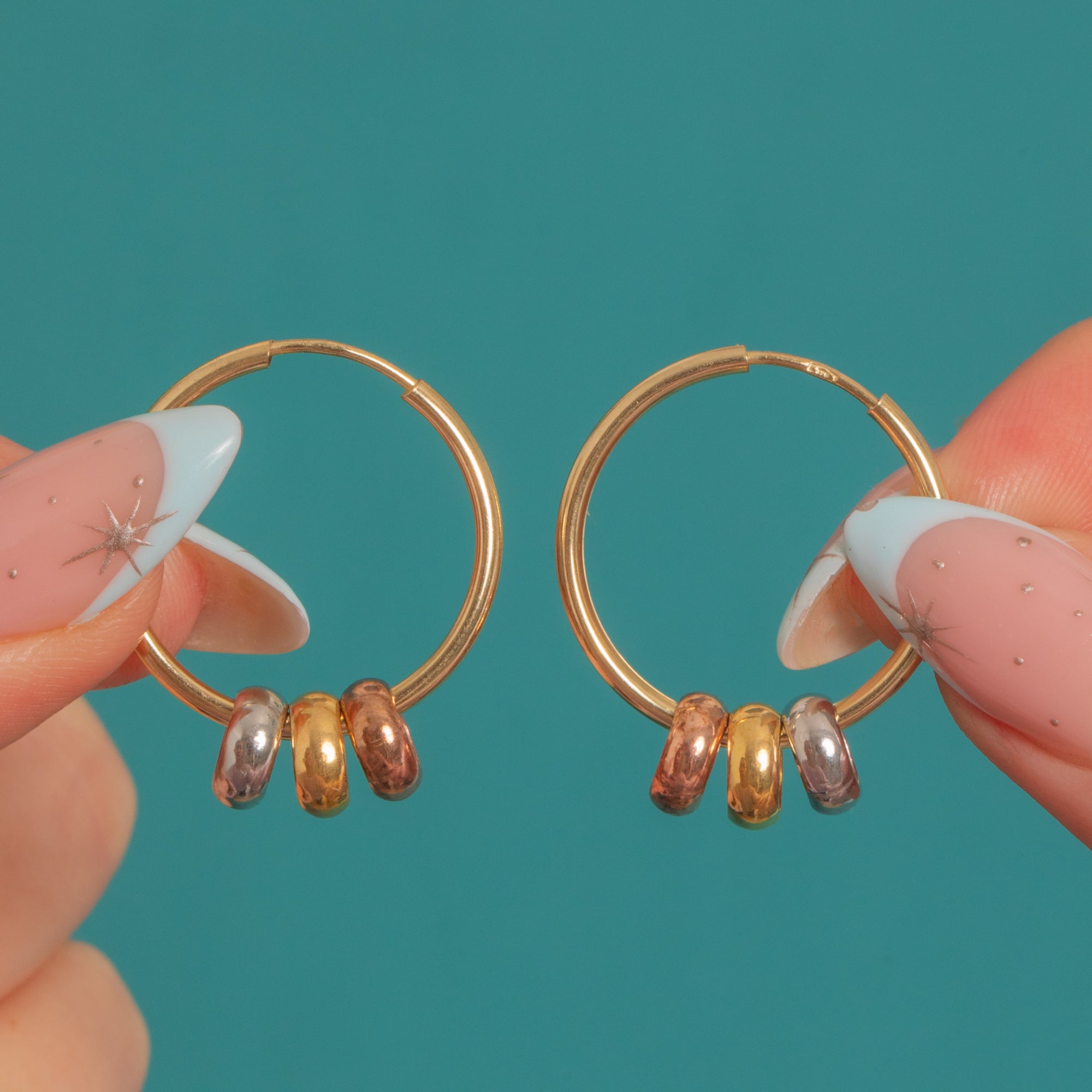 MATERIALS: Tests as 9ct Gold, 9ct Yellow Gold hoops, removable 9ct Yellow Gold, 9ct White Gold and 9ct Rose Gold decorative hoop dangles