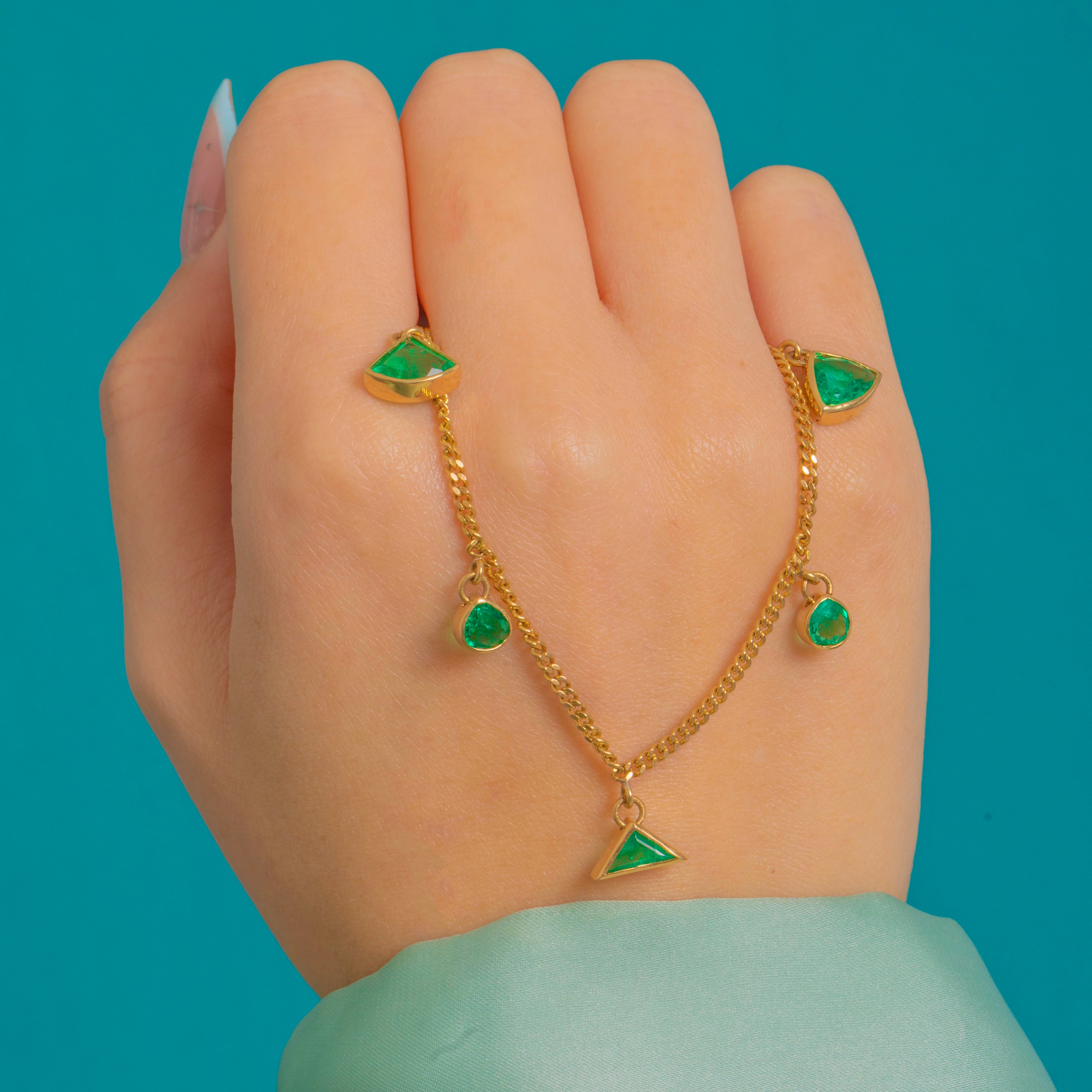 Crafted in glowing 18ct Gold and finished with a neat bolt ring clasp, the Emeralds total approximately 1.75cts and are showcased in open-backed bezels to invite light. Italian stamps to the clasp complete this chic, layerable treasure.