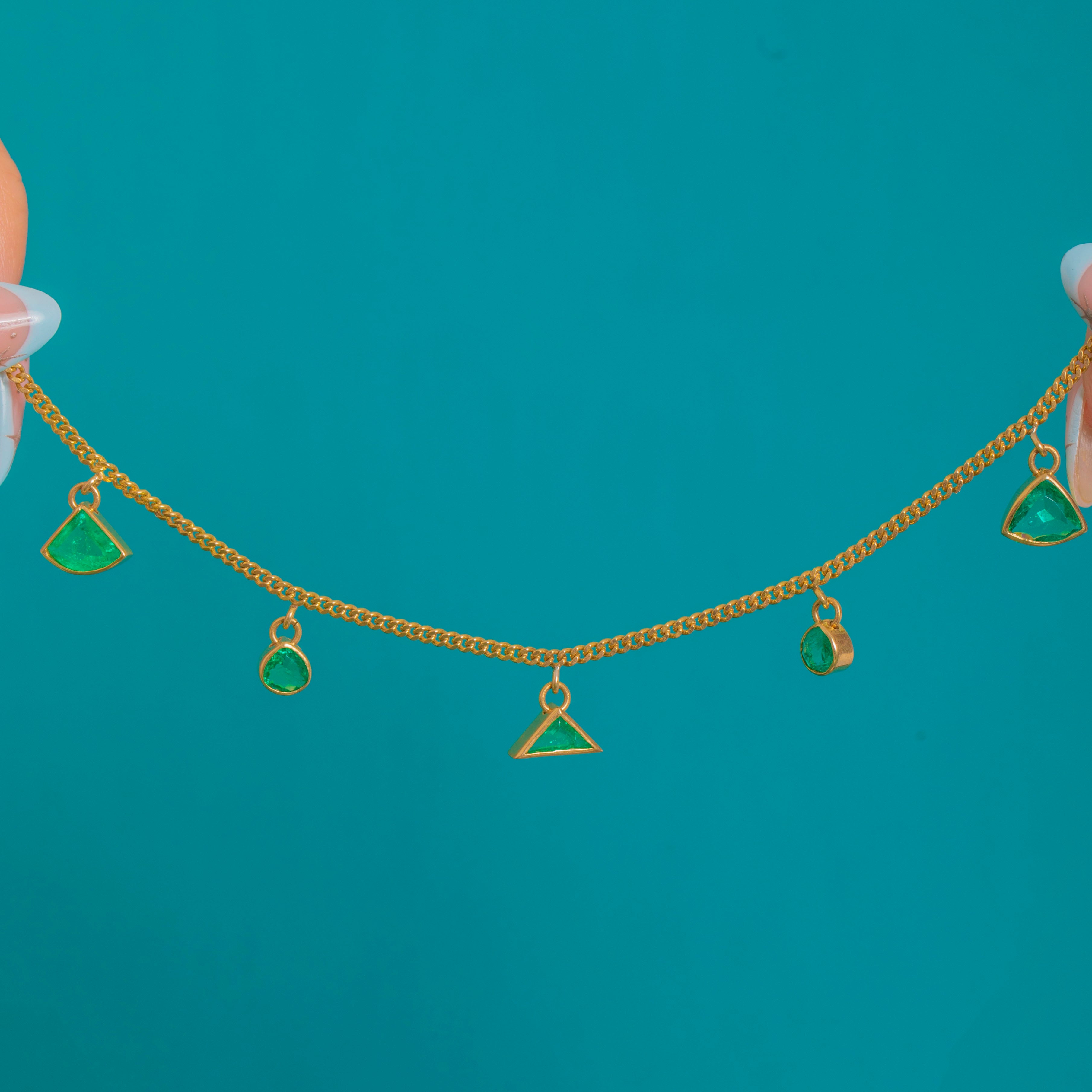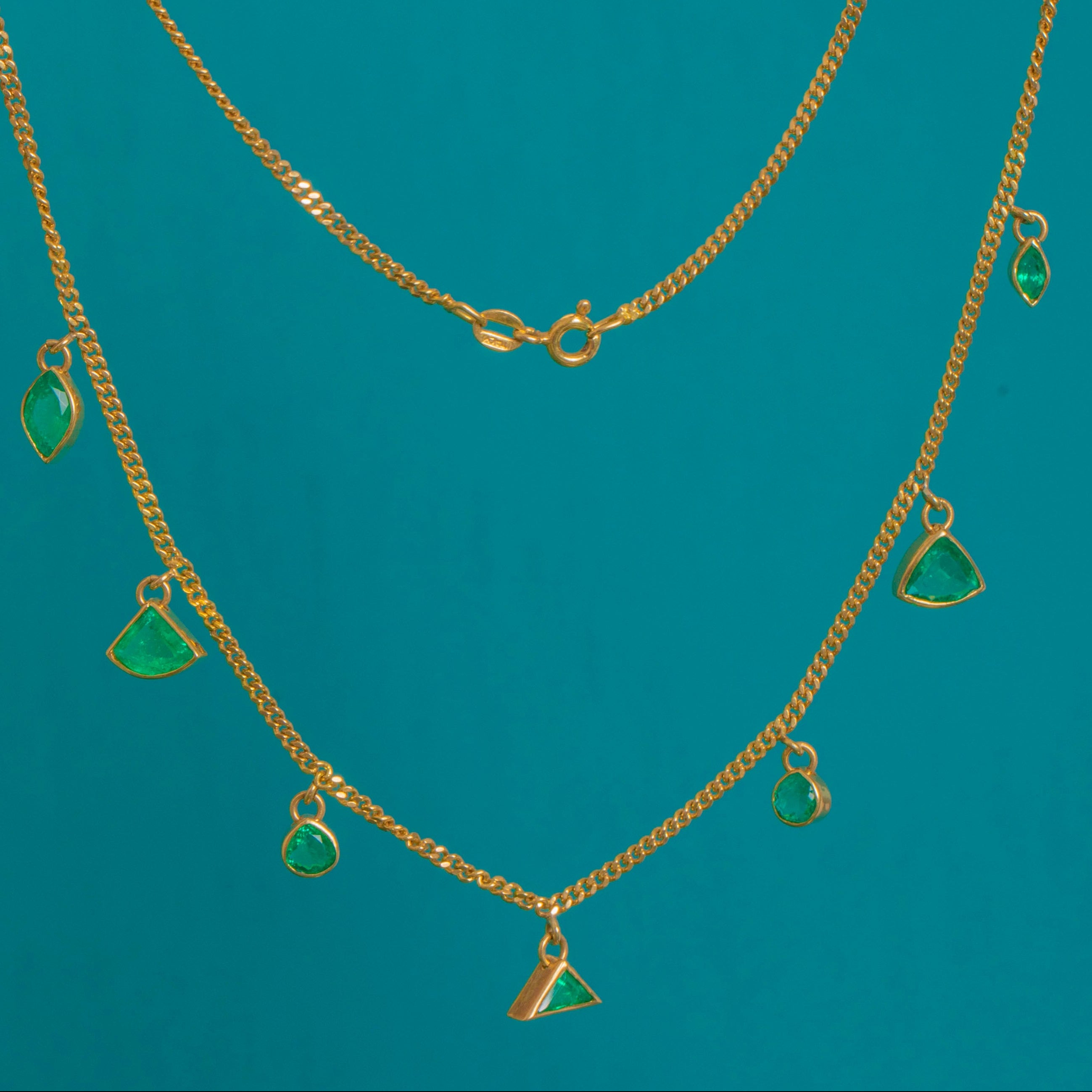 A vivid fringe of Emeralds dances across a fine 18ct Gold curb chain in this elegant Vintage necklace. Each bright green stone is bezel-set and articulated on tiny jump rings for beautiful movement, creating a graceful, geometric station silhouette with a refined, contemporary feel.