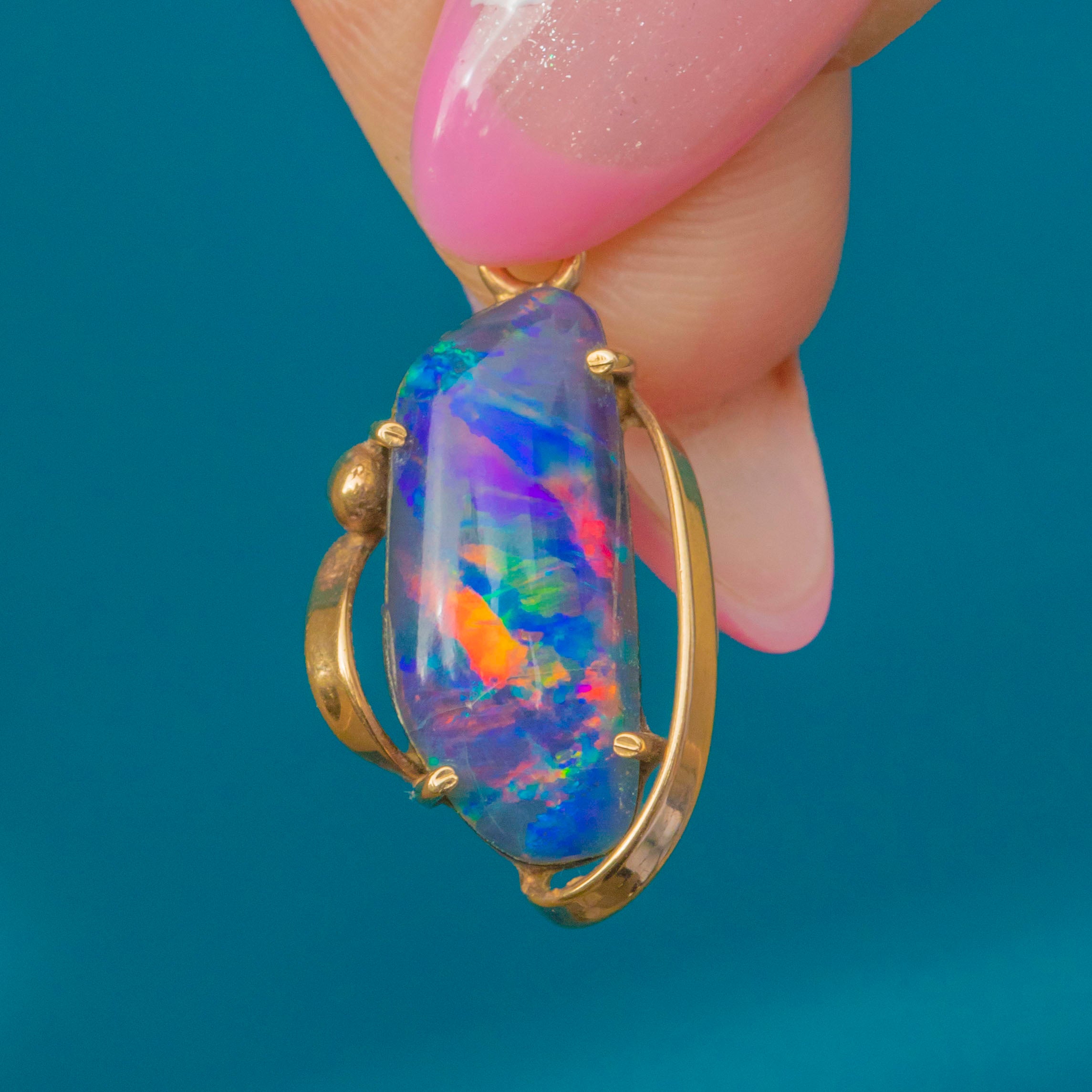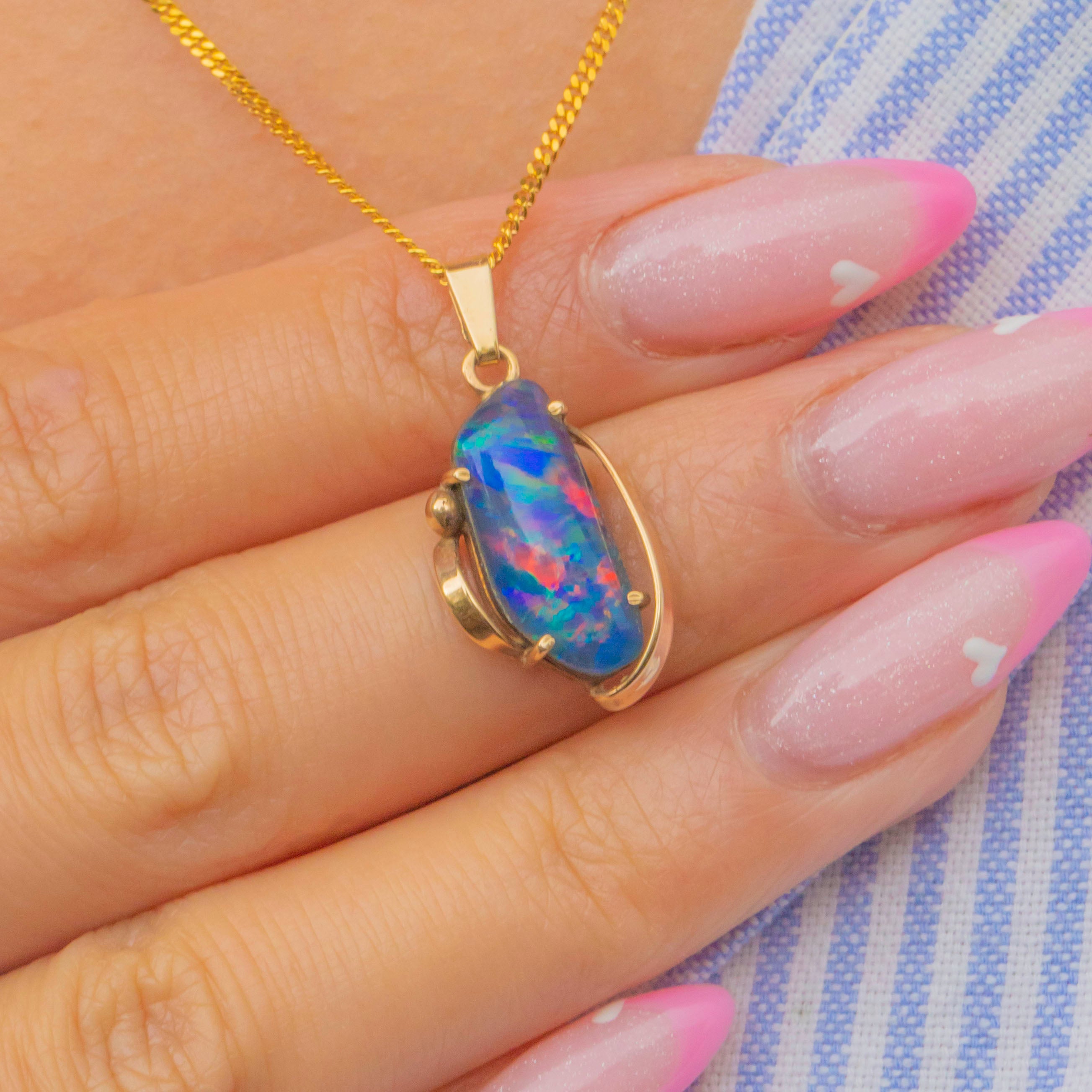 This striking pendant showcases a vivid Opal triplet bursting with electric flashes of blue, pink and green. The Opal’s dramatic play-of-colour is beautifully enhanced by its sculptural 9ct Gold setting, complete with decorative side detailing that flows around the gem like liquid Gold.