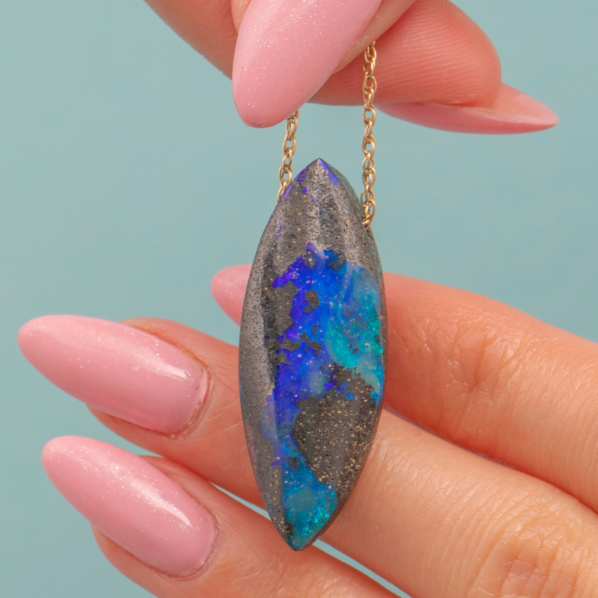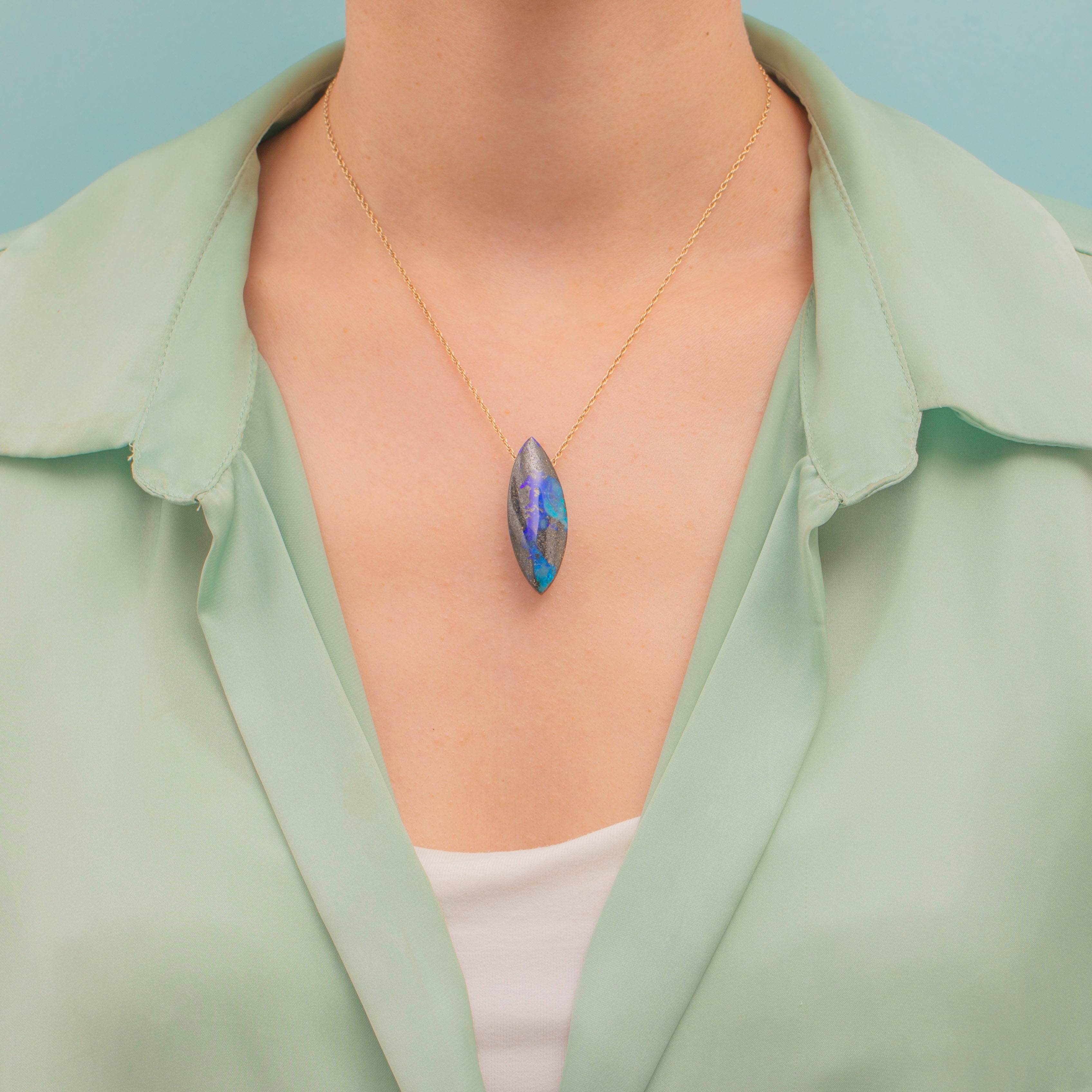 If you have a penchant for unique jewels, this Wood Opal navette pendant is a must for your collection! Carved into a striking navette shape, the Wood Opal reveals sections of bright green whisps swirling amongst a deep, royal blue core.